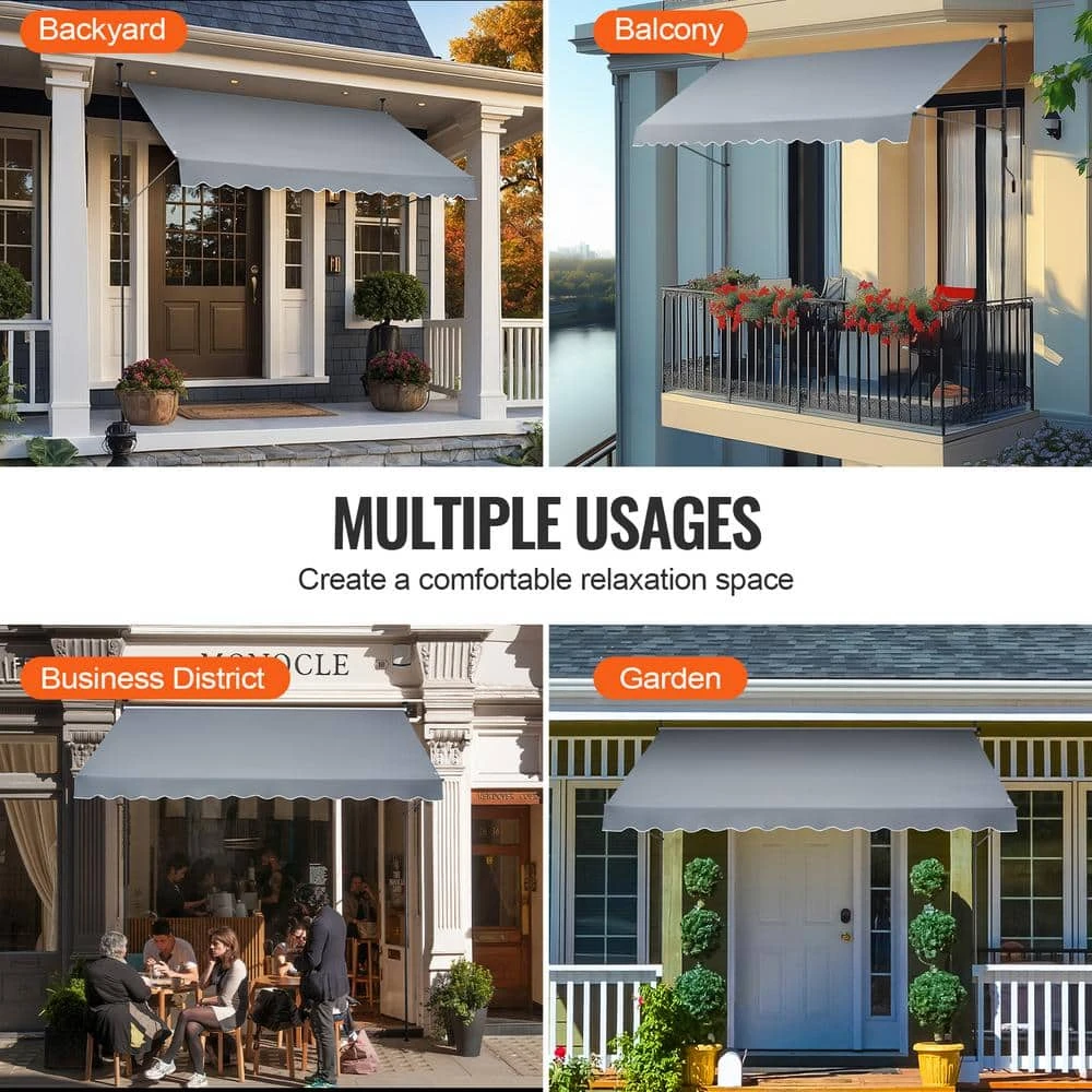 VEVOR Patio Awning Retractable-Transform Your Outdoor Space with Our Easy-to-Install Retractable Patio Awning. The large 138 x 47 in. retractable patio awning is primarily made from steel and features a 180 G double-sided PU coating, providing UV protection with a rating of UV 80-plus. It offers sunshade and waterproof capabilities, with an adjustable support pole height from 86 to 122 in., making it suitable for various door and window heights. The fabric can be easily extended and retracted for storage, ensuring user-friendly operation without the need for drilling, and can be installed by 1-person.