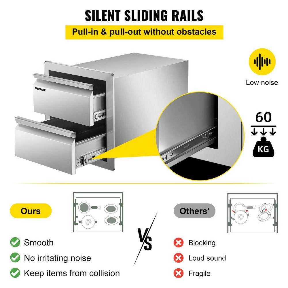 If you are looking for outdoor kitchen drawers, the VEVOR drawer is a good choice for your BBQ island. Our outdoor BBQ drawer is constructed of stainless steel, waterproof and corrosion-proof. The large drawer provides an incredibly convenient place to store all of your kitchen tools. Our smooth sliding rails have low noise and ensure your cooking materials do not collide with each other. Take control of your backyard kitchen with our drawers and enjoy every occasion.
