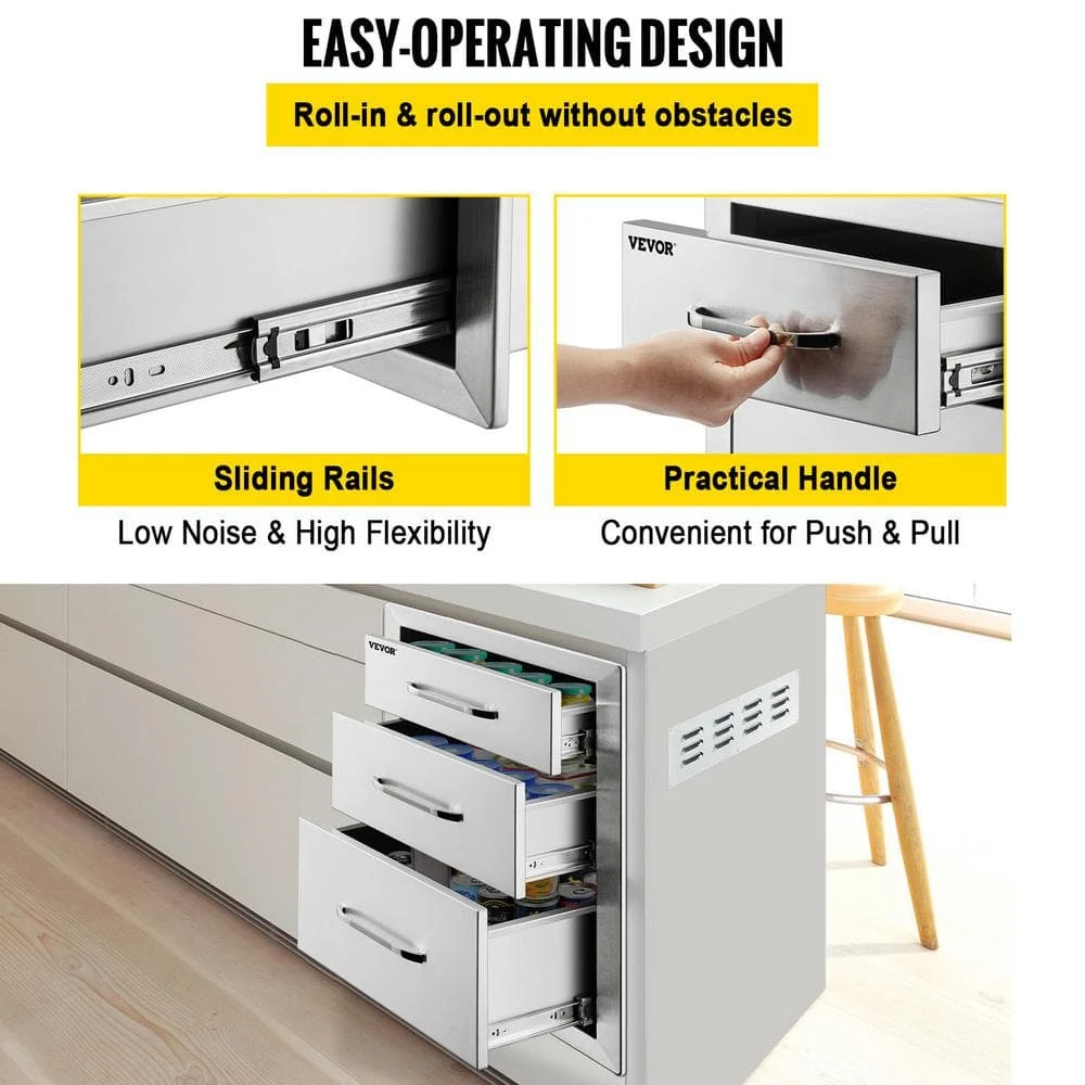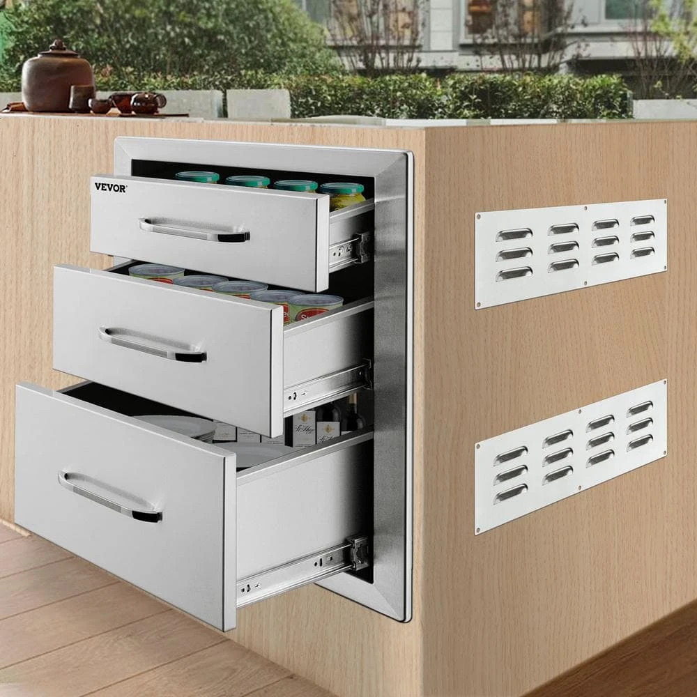 VEVOR Premium outdoor kitchen drawers with double storage space, ensuring a large storage space to put kitchen things. Made of stainless steel, it is durable and sturdy for long-time use. Also anti-corrosion and easy to clean. With the fully enclosed box, it can effectively prevent the insides from rain, wind, dust and insect. Perfect for the outdoor kitchen and BBQ island to use.