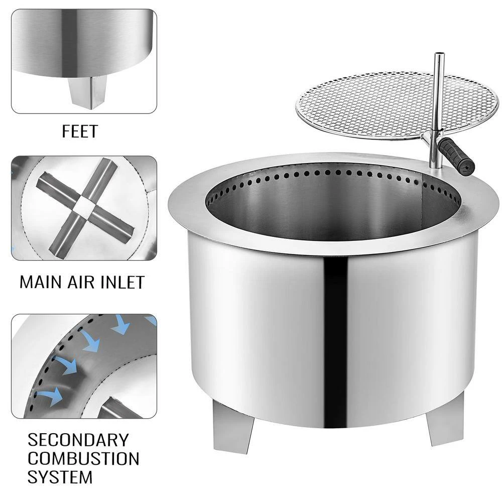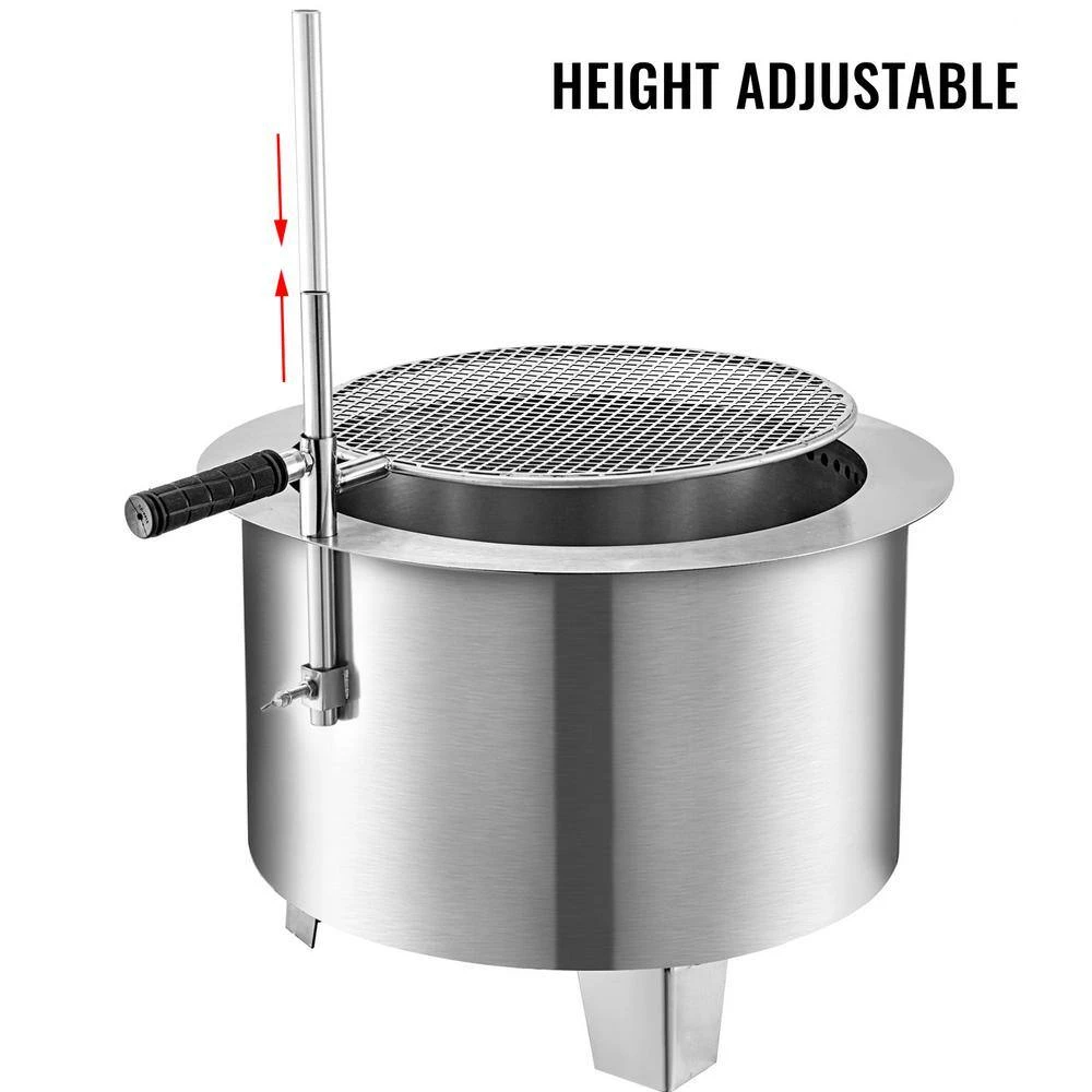 The VEVOR Stainless Steel Fire PitGet ready for a delicious barbecue with this fire pit. The grill and bucket adopt durable stainless steel for aesthetic appearance and rust resistance. The 4 bottom vents feed the fire and the small top holes help the Oxygen add-in and make the combustion more full. The adjustable grill and column are designed for convenient usage and better cooking control. Compact size and light weight make it easy to carry. Suitable for the garden party, outdoor travel, camping, barbecue, etc.