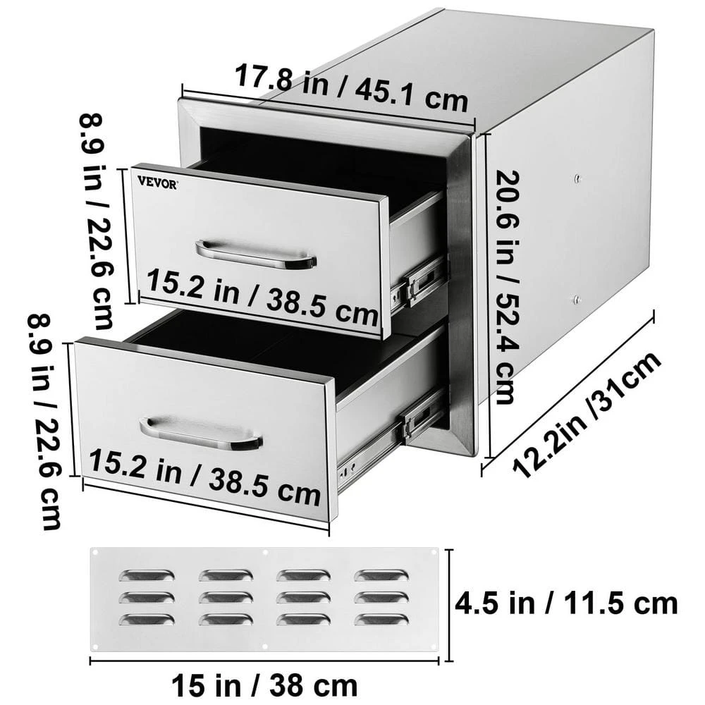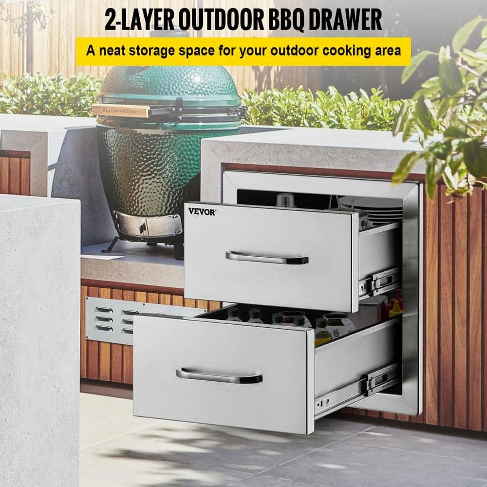 VEVOR Premium outdoor kitchen drawers with double drawers and a paper towel holder, ensuring a large storage space to put outdoor kitchen accessories. Made of stainless steel ensure durable and sturdy for long-time use. With the fully enclosed box, it can effectively avoid the entry of many kinds of foreign objects. Perfect for the outdoor kitchen and BBQ island to use.