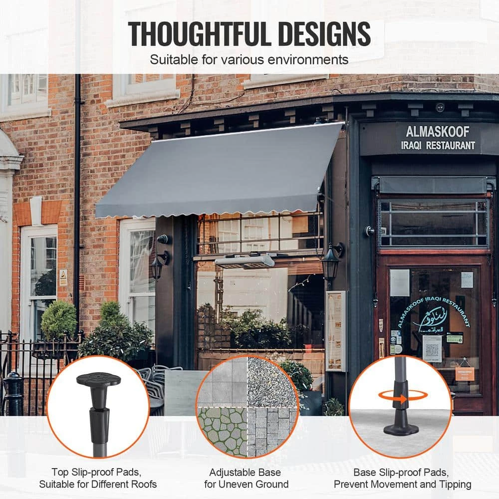VEVOR Patio Awning Retractable-Transform Your Outdoor Space with Our Easy-to-Install Retractable Patio Awning. The large 178 x 47 in. retractable patio awning is primarily made from steel and features a 180 G double-sided PU coating, providing UV protection with a rating of UV 80-plus. It offers sunshade and waterproof capabilities, with an adjustable support pole height from 86 to 122 in., making it suitable for various door and window heights. The fabric can be easily extended and retracted for storage, ensuring user-friendly operation without the need for drilling, and can be installed by 1-person.