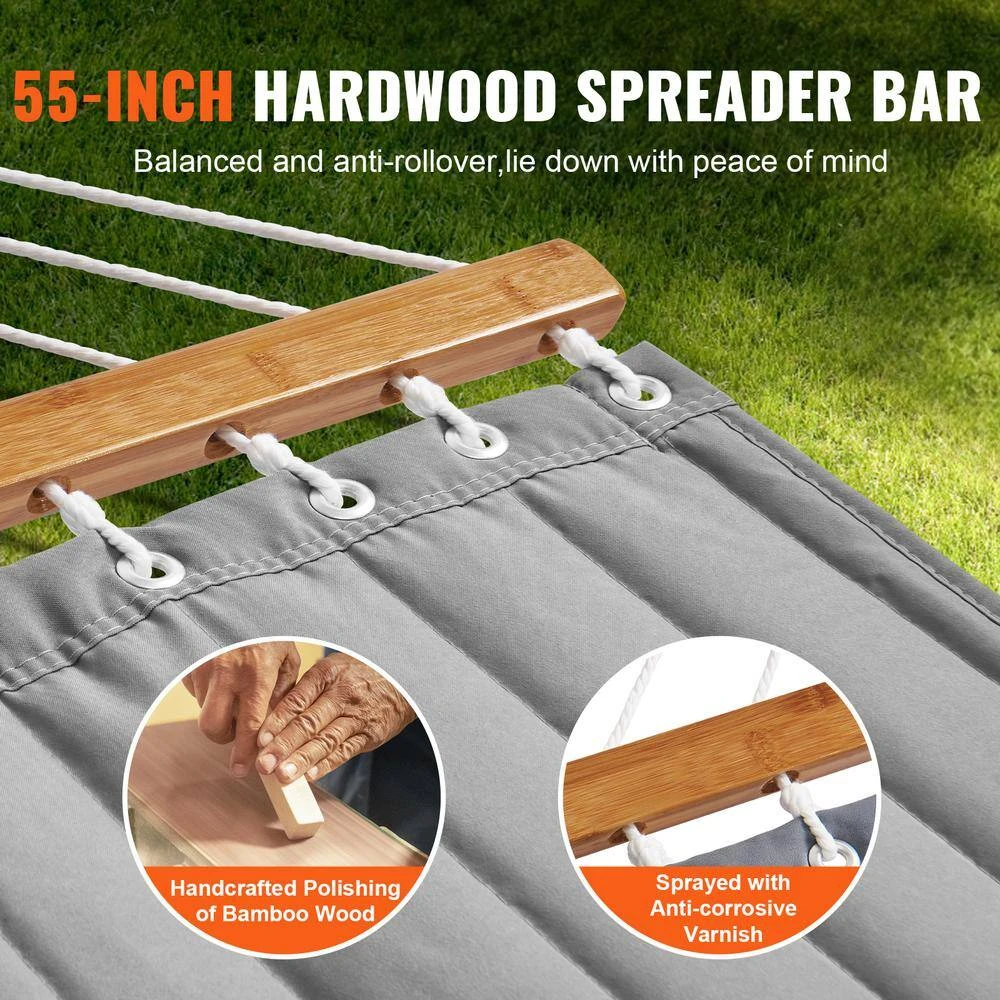 VEVOR Double Quilted Fabric Hammock.Indulge in ultimate outdoor relaxation with VEVOR’s double quilted fabric hammock with stand. Crafted for lasting comfort and reliability, our hammock features 200g quilted cotton, reinforced ends, stable steel stand, hardwood spreader bars and handwoven ropes, providing endless outdoor fun.