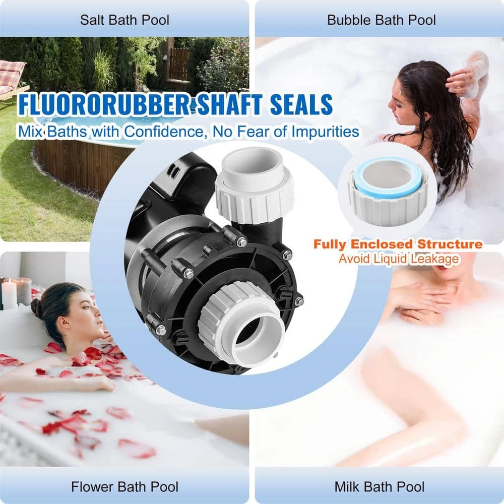 - Seal against leakage: anti-leakage is the key to the SPA pump for hot tubs, so we only use fluor rubber shaft seals, which have good resistance to high temperature, corrosion, oil and aging and are able to maintain stable sealing performance in harsh working environments, it effectively avoids the leakage of fluids and particles, you can enjoy different types of soaking massages without worrying about infiltration problems