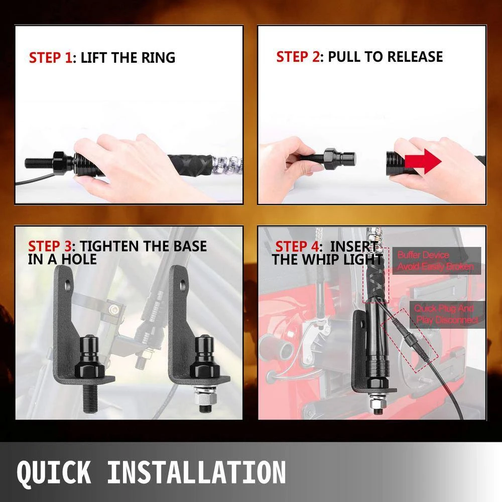- Plug and play and 5 ft. 2pcs- the light comes with plug-and-play components, easy for installation. Lift the ring, pull to release, and plug in the whip lights to the hole of the base on a vehicle, wire the wires to auxiliary 12 v or switch., install the safety whip light with ease