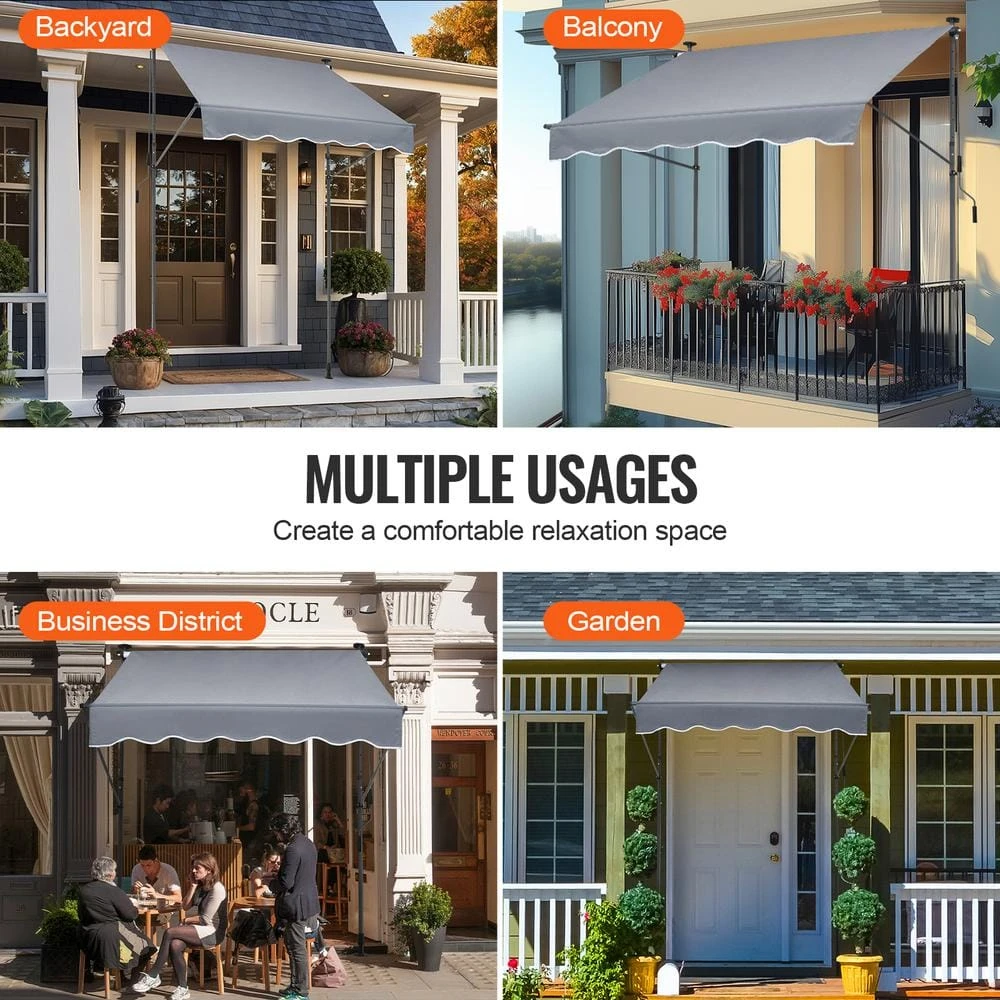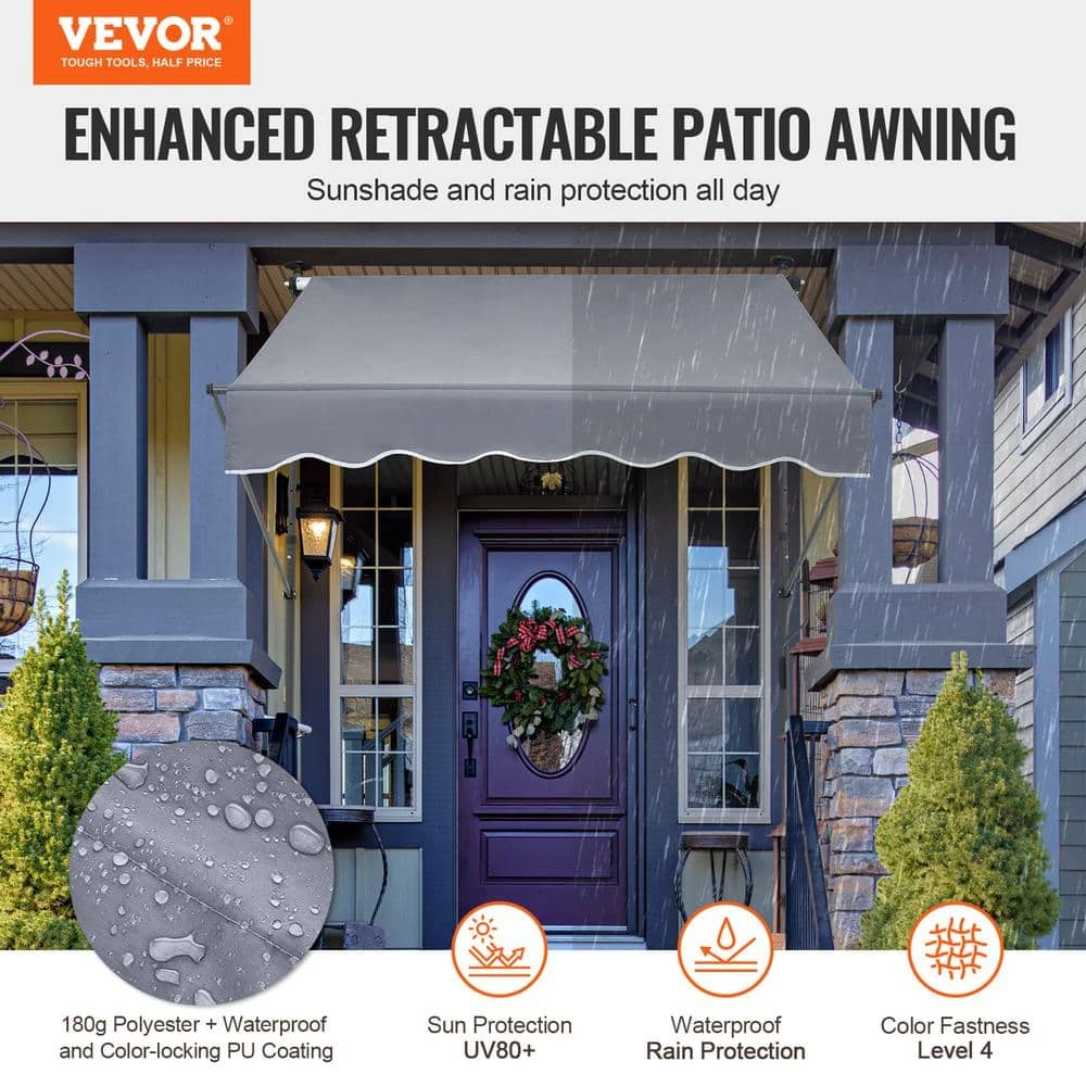 VEVOR Patio Awning Retractable-Transform Your Outdoor Space with Our Easy-to-Install Retractable Patio Awning. The large 59 x 47 in. retractable patio awning is primarily made from steel and features a 180 G double-sided PU coating, providing UV protection with a rating of UV 80-plus. It offers sunshade and waterproof capabilities, with an adjustable support pole height from 86 to 122 in., making it suitable for various door and window heights. The fabric can be easily extended and retracted for storage, ensuring user-friendly operation without the need for drilling, and can be installed by 1-person.