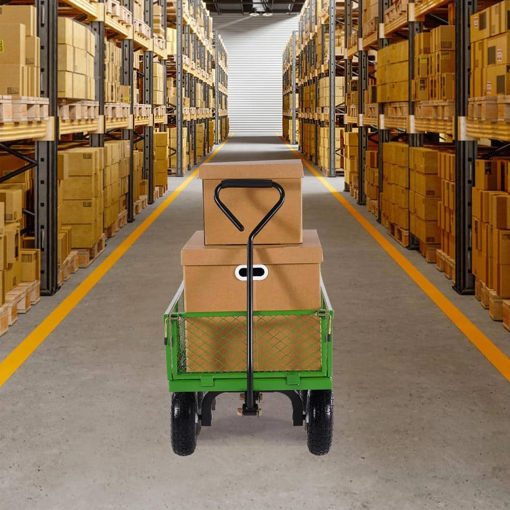 900 lbs. Heavy-Duty Garden Cart. Built with Q235 steel, this manual garden cart supports up to 900 lbs. and features a 2-in-1 design, switching between fenced and flatbed modes. Equipped with 10 in. rubber tires, it handles various terrains. The ergonomic handle ensures a comfortable grip for gardens, farms, warehouses.