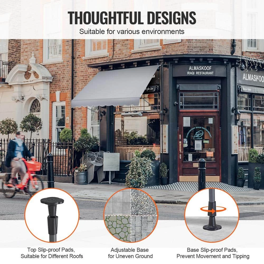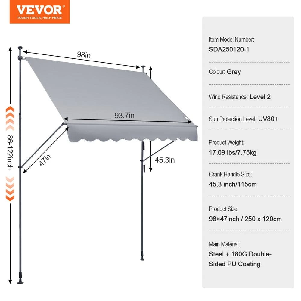 VEVOR Patio Awning Retractable-Transform Your Outdoor Space with Our Easy-to-Install Retractable Patio Awning. The large 98 x 47 in. retractable patio awning is primarily made from steel and features a 180G double-sided PU coating, providing UV protection with a rating of UV 80-plus. It offers sunshade and waterproof capabilities, with an adjustable support pole height from 86 to 122in., making it suitable for various door and window heights. The fabric can be easily extended and retracted for storage, ensuring user-friendly operation without the need for drilling, and can be installed by 1-person.