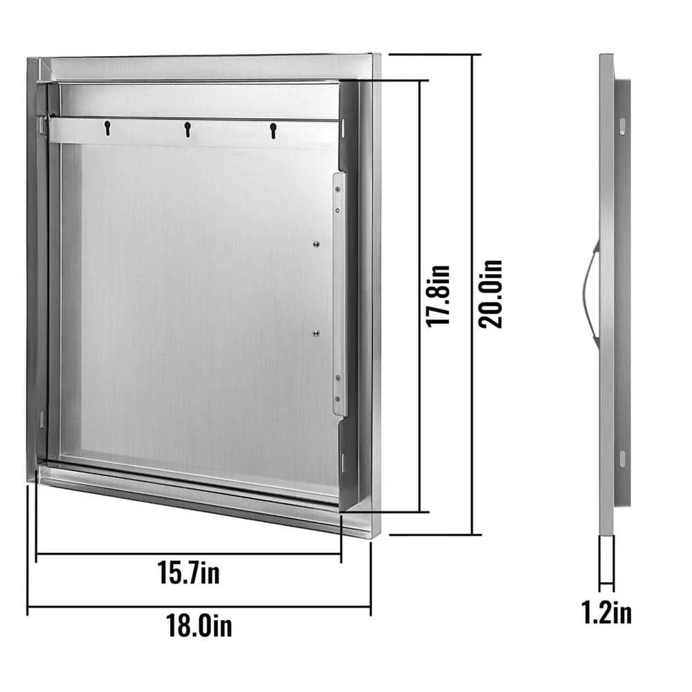 - Durable Construction: Overall dimensions: 18 in. W x 20 in. H, cutout dimensions: 15.7 in. W x 17.8 in. H, the outdoor kitchen door, constructed with stainless steel, features corrosion and abrasion resistance, the brushed surface makes the door appealing, and it is easy to clean with no marks or smudges left, all seamless design and no sharp corners safeguard users’ security