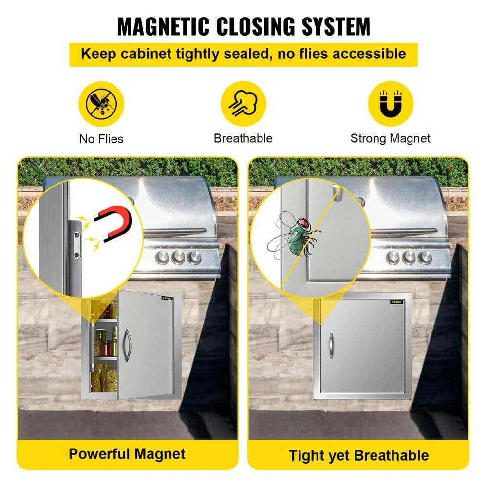 The VEVOR BBQ island door is designed for the outdoor kitchen and BBQ island, being an elegant addition to your cooking area. With premium stainless steel, this outdoor BBQ door features improved corrosion-proof and scratch-proof performance, withstanding-years of exposure to all kinds of weather. In addition, the seamless design and magnetic closing system keep the stainless steel door tightly sealed, with no dust, rainwater, or flies accessible.