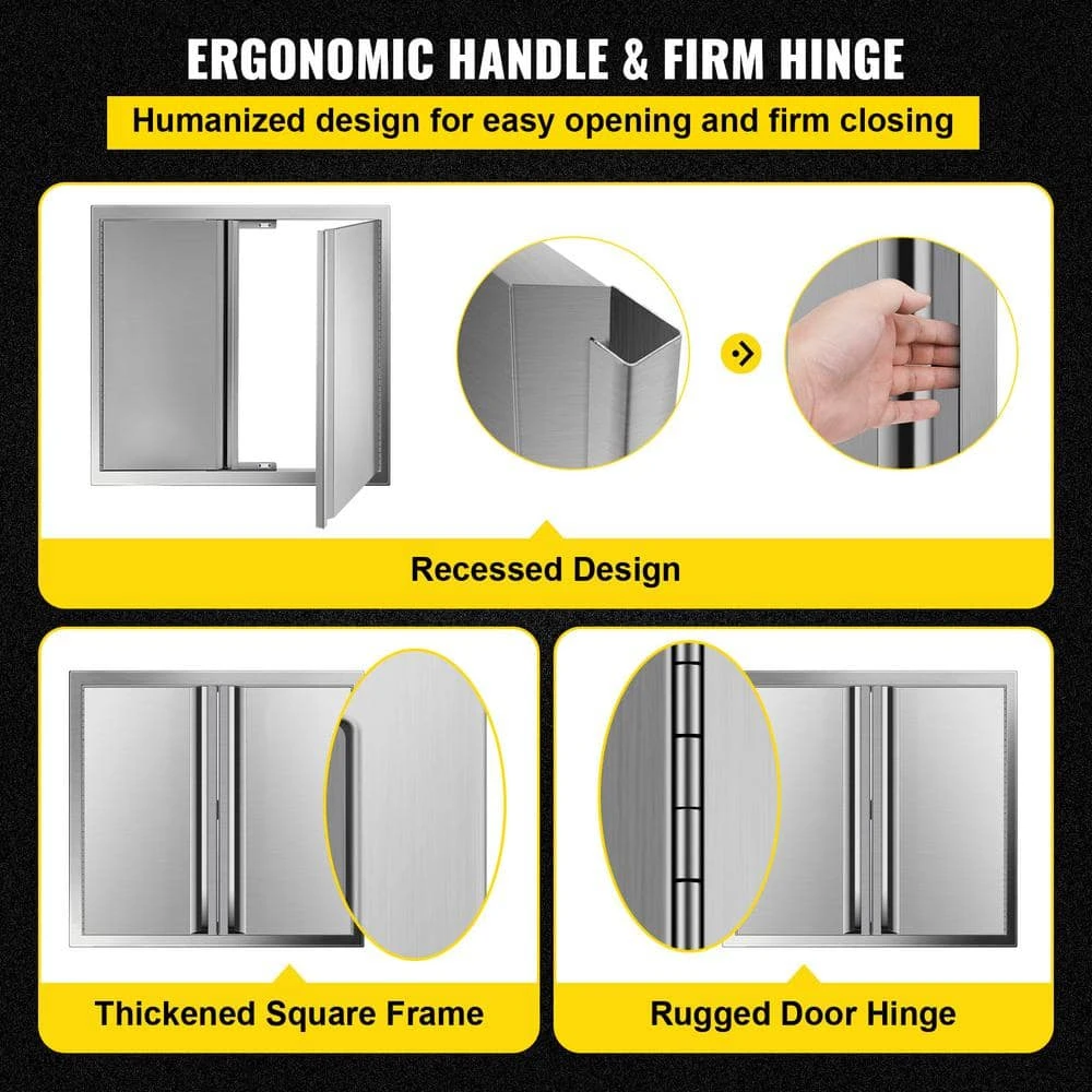 - Durable construction: overall dimensions: 24 in. W x 24 in. H, cutout dimensions: 21.8 in. W x 21.8 in. H, the outdoor kitchen doors, constructed with stainless steel, feature corrosion and abrasion resistance, the brushed surface makes the door appealing, and it is easy to clean with no marks or smudges left, all seamless design and no sharp corners safeguard users’ security