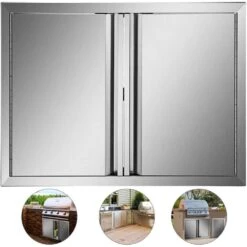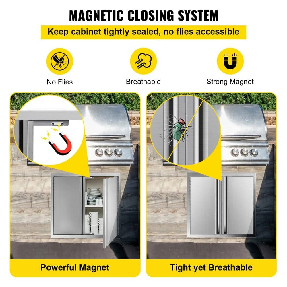 The VEVOR BBQ island doors are designed for the outdoor kitchen and BBQ island, being an elegant addition to your cooking area. With premium stainless steel, these outdoor BBQ doors feature improved corrosion-proof and scratch-proof performance, withstanding-years of exposure to all kinds of weather. In addition, the seamless design and magnetic closing system keep the stainless steel doors tightly sealed, with no dust, rainwater, or flies accessible.