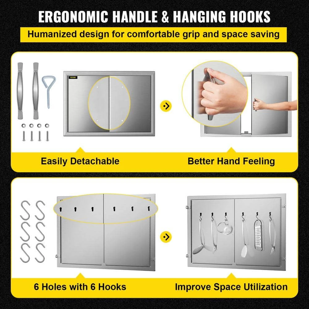 - Ergonomic Handles: The exquisite and ergonomic handles on the BBQ access doors delight each opening with comfortable hand feeling and are not easy to scratch your hand. Open the doors, and you will find 6 holes for hanging hooks on the inner wall. 6 sturdy hooks are also provided, which allows you to hang BBQ tongs, gloves, and other grill stuff inside the doors to save space