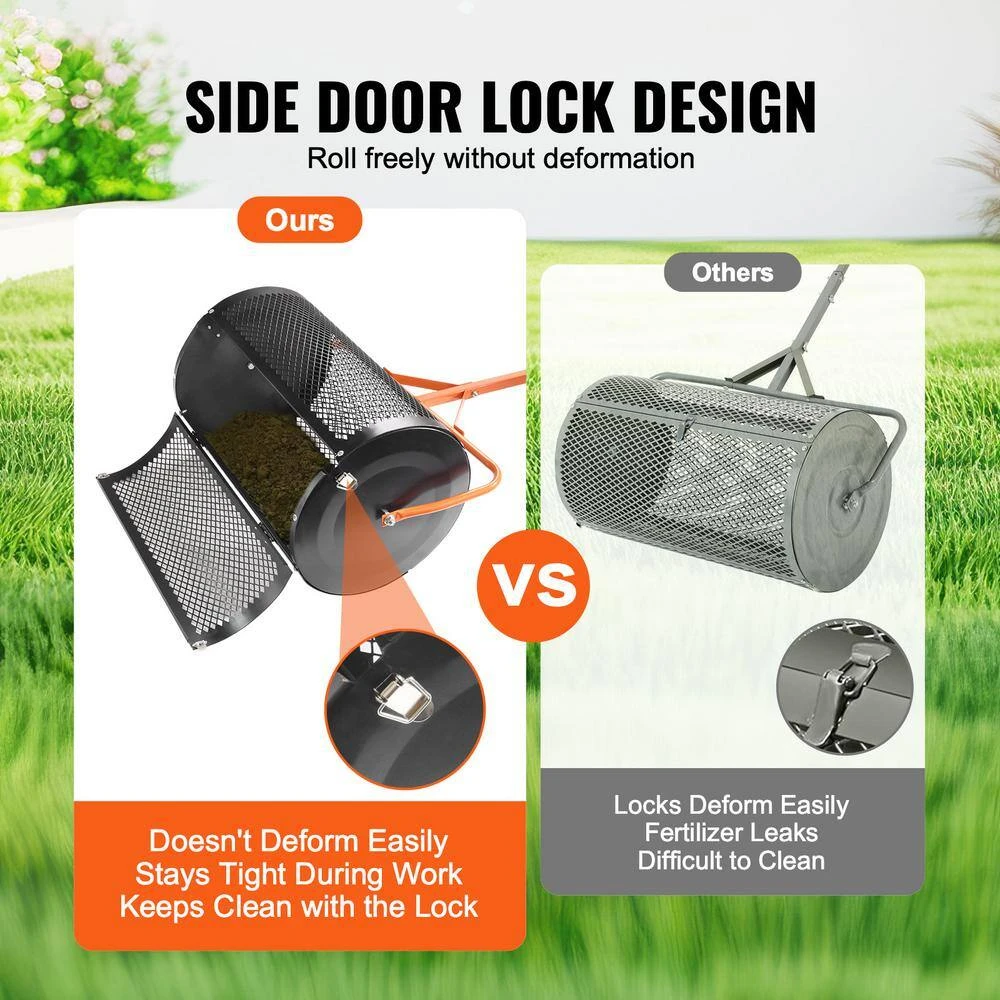 - Easy to operate and install: the peat moss spreader is equipped with an upgraded hinge design that allows for a wider opening angle, making it easier to fill and clean the spreading materials the side gate lock is positioned for safety and stability during use. installation is simple and takes only 10 minutes; just assemble the disc, basket plates, and handle rod in sequence, and you’re ready to go. this makes your gardening tasks easier and more enjoyable