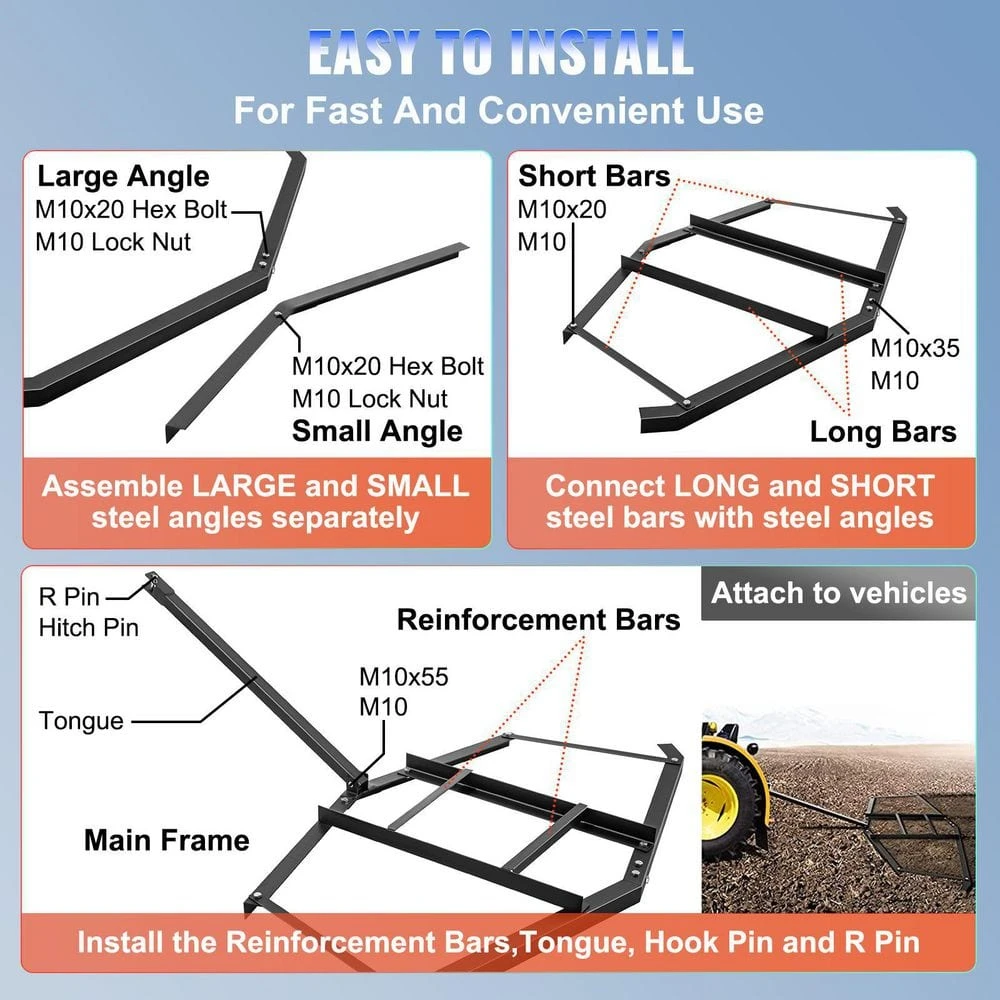 - Wide Application: The lawn leveling rake is suitable for attaching to most ATV, UTV, Garden Tractors, and Utility Tractors to make your dragging jobs efficient and convenient. You can use it to level Driveways, Yards, Fields, etc