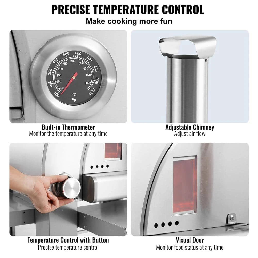 22 in. Outdoor Pizza Oven. Bake a 22 in. pizza in 9-seconds with temperatures up to 1000°F/540℃. Supports gas and various wood fuels like pellets, wood chips and charcoal. Equipped with convenient rolling casters for easy mobility, suitable for any outdoor setting, perfect for family and friend gatherings.
