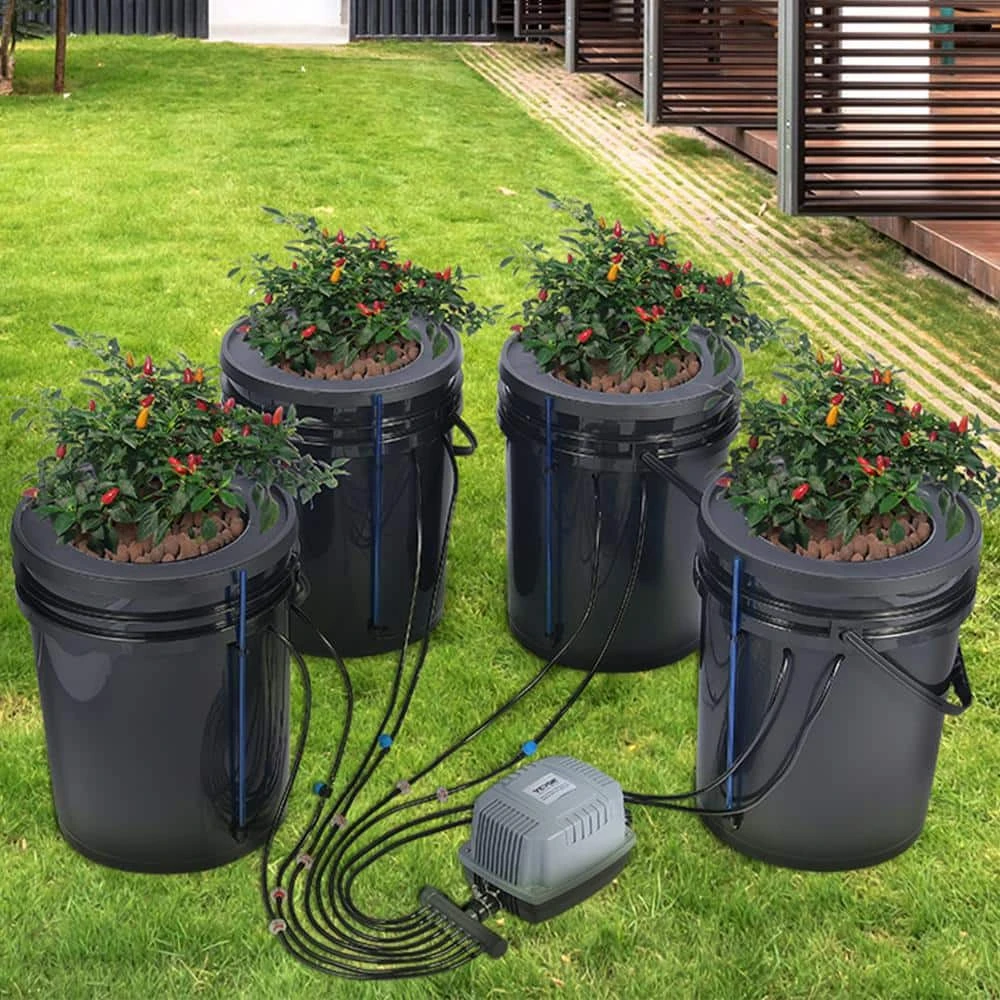 - Package content: 4 x planting buckets, 8 x inline check valves, 1 x 8-outlet air pump, 1 m x 12 m black feed air hose, 4 x air stones, 16 x sealing rings4 x water level tubes, 4 x buckles, 4 x red floating balls, 4 x drip irrigation pipes, 4 x water inlet tubes, 4 x bags of expanded clay, 4 x air flow regulators, 1 x assembly instruction
