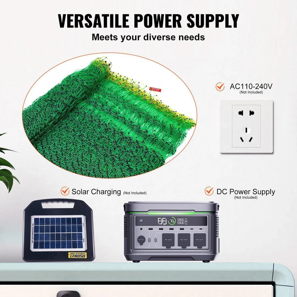 VEVOR Electric Fence Netting Kit. Your farm deserves a comprehensive, sturdy and reliable electric fence. Ours features an oversized design, made of PE and stainless steel wire materials, with upgraded solid posts and added windproof ropes and ground stakes. It ensures the security of various poultry and livestock, making farm management easier and more efficient. Choose us for peace of mind in farm security.