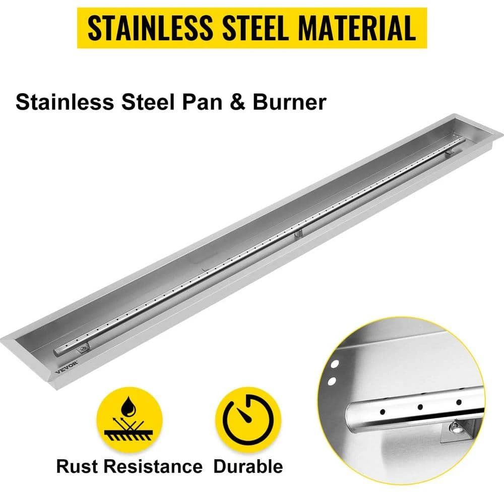 - Specification:Material: Full Stainless Steel Construction,Item Size(LxWxH): 61 x 8 x 2 in.,Installation size(LxW): 59 x 6 x 2 in.,Gas Inlet Size: 1/2 in. NPT,Fill-in Fire Glass: About 50 lb.,Applicable Fuel: Propane Gas/Natural Gas,Gross Weight: 12 lb.