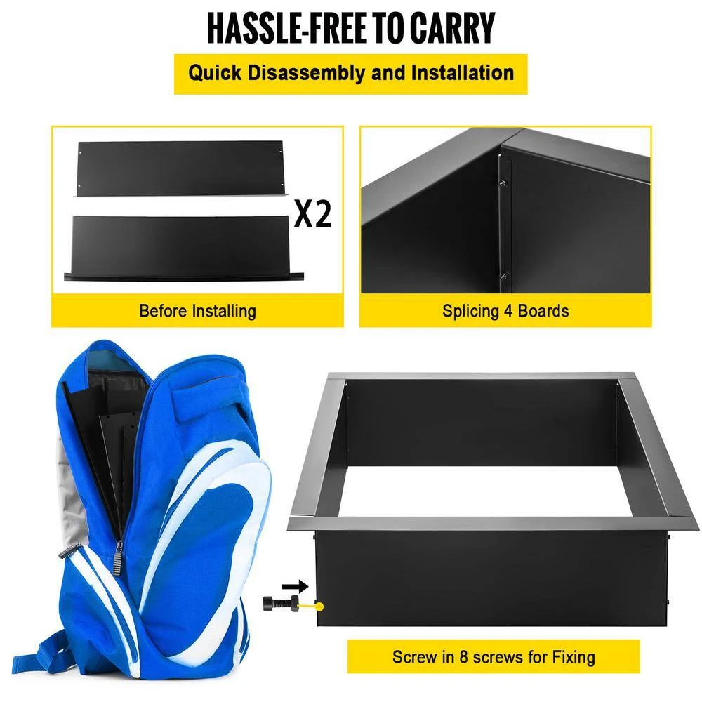 36 in. x 36 in. Square Fire Pit Ring. This fire pit ring is constructed with thickened steel plates with a blacking coating surface for high heat-proof and wear-proof. it has a 36 in. x 36 in. large capacity for holding more burning materials and can be DIY by your hand for various decoration needs it is easy to assemble with 8 screws and convenient for operation with a pair of extra tongs it is ideal for camping, fishing or barbecue.
