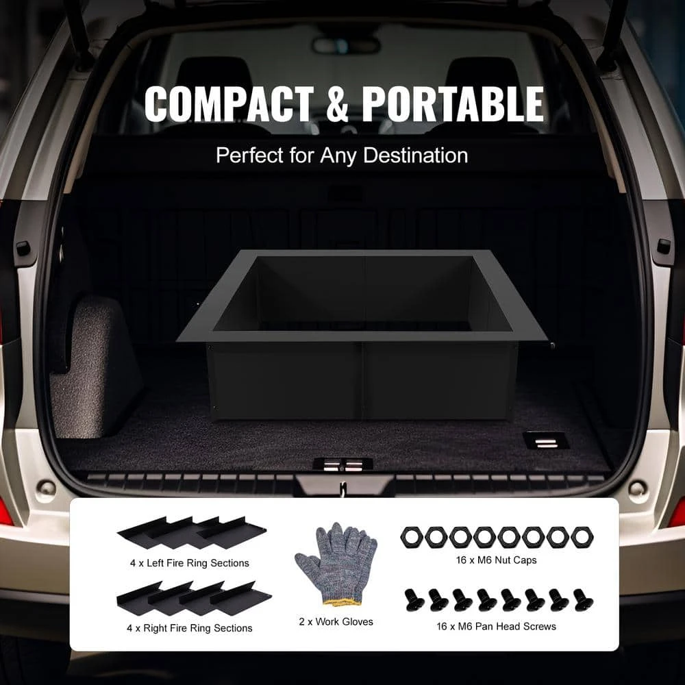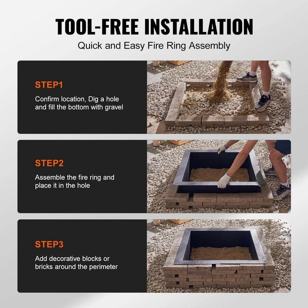 Enjoy Cozy Fires with VEVOR’s Rust-Resistant Fire Ring. This fire ring, made from high-temperature resistant carbon steel with a matte black powder coating, resists rust and corrosion. It provides ample space for flame growth, ideal for park or backyard camping, creating a warm atmosphere for holiday nights or gatherings with friends.