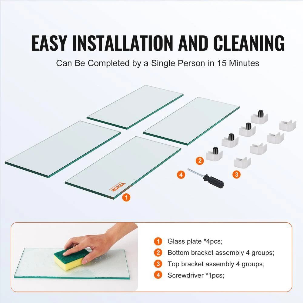 - Package Content:Glass Panels x 4,Bottom Bracket Components x 4 Sets,Top Bracket Components x 4 Sets,Screwdriver x 1,Instruction Manual x 1