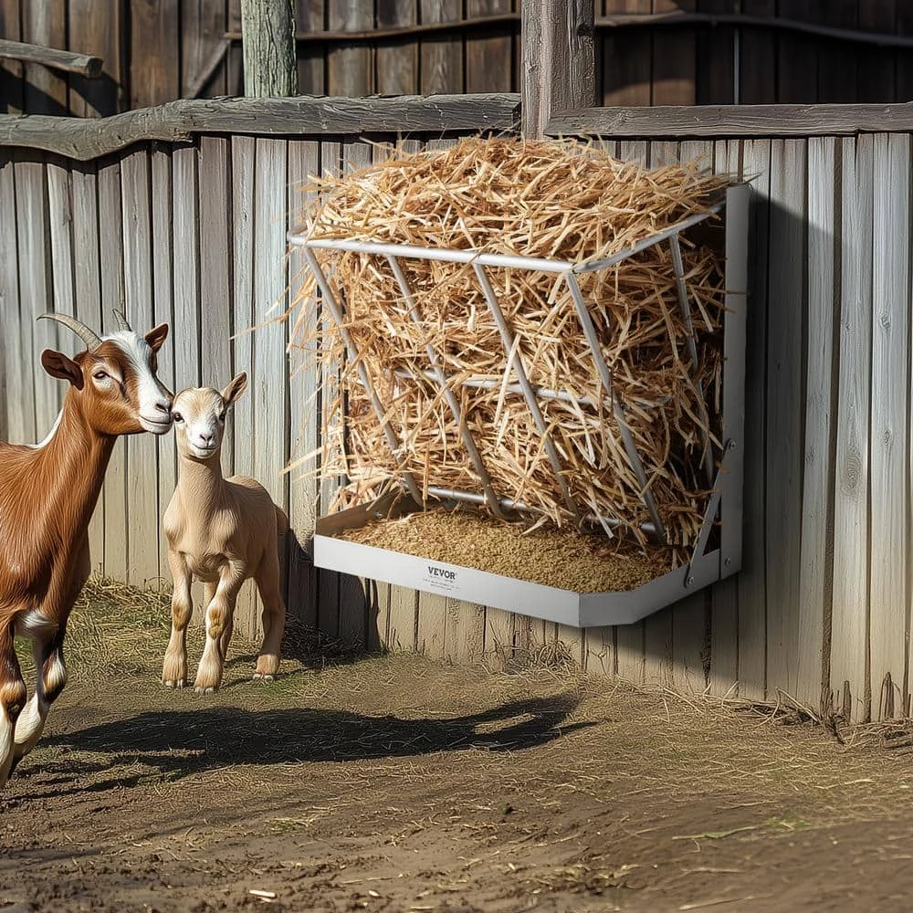VEVOR 2 in 1 Hay and Grain Feeder 39.5 Gal.s.This wall mounted feeder combines 39.5 gal.s (including 21.5 gal. tray capacity), 2-in-1 feeding, heavy-duty steel and rounded edge design, suitable for up to 5 goats to eat at the same time, and easily mounted on various walls. Fully welded and powder coated for durability.
