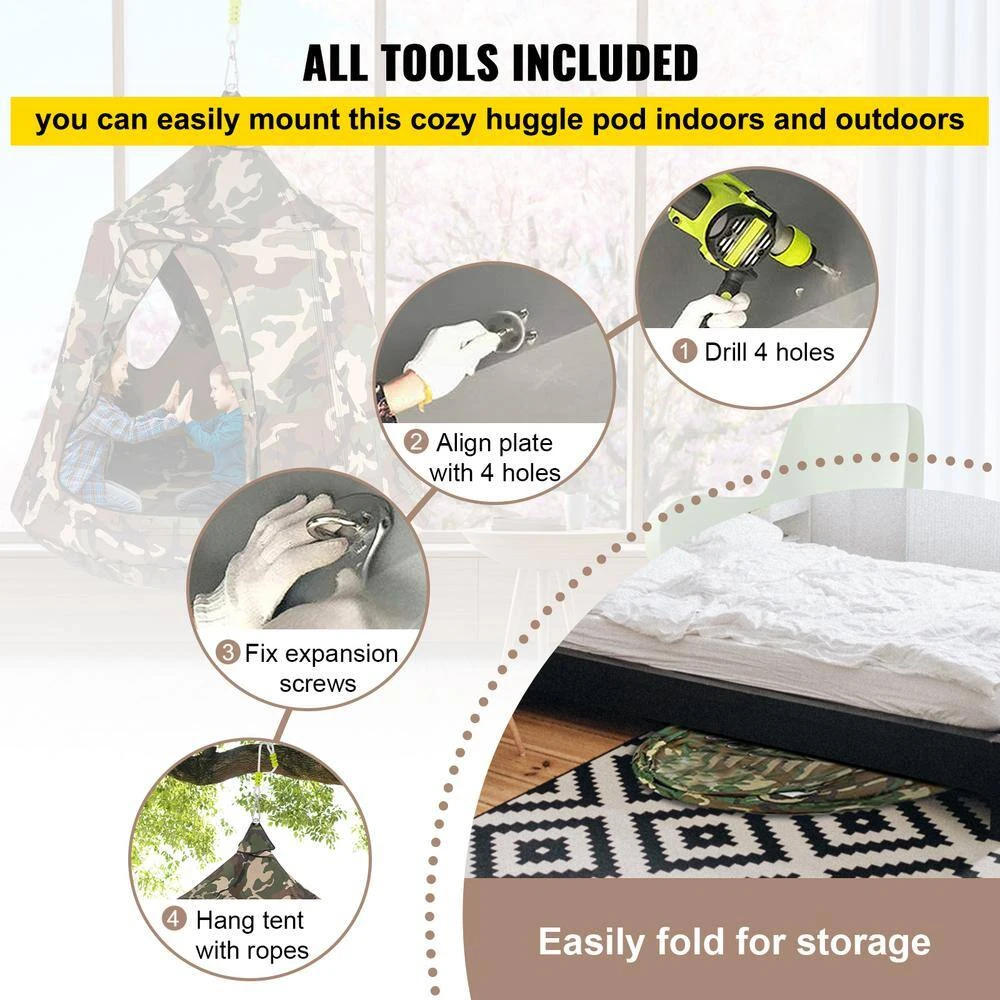 The VEVOR hanging tree tent goes beyond all the fun of our classic tent. It is lightweight and portable, and easy to hang almost anywhere, so it can travel wherever your family roams. You can take it to the beach, the park, camping, grandma’s house, or just your backyard to make a comfortable spot to play, read, listen to music, or just snuggle.