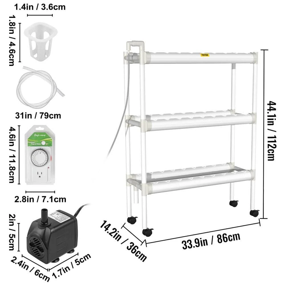 - 54 sites hydroponic growing system: layers: 3, pipe quantity: 6, hole quantity: 54, pipe size: 2.5 in. x 31 in. spacing between holes: 2 in. overall dimension: 33.9 in. x 14.2 in. x 44.1 in. the proper dimension allows you to harvest fresh vegetables as few or as many as you like