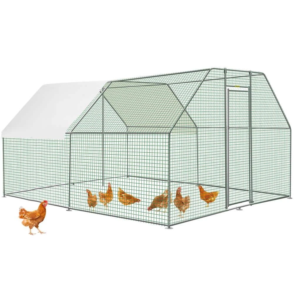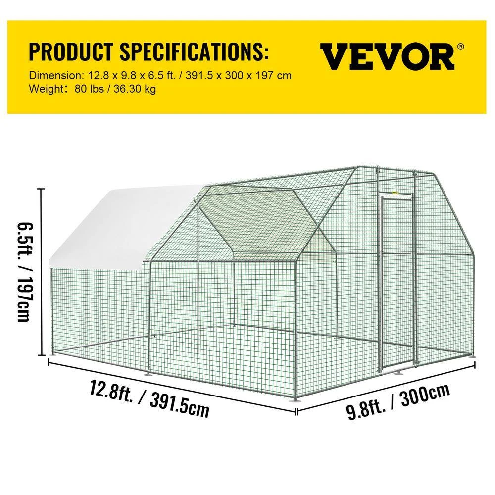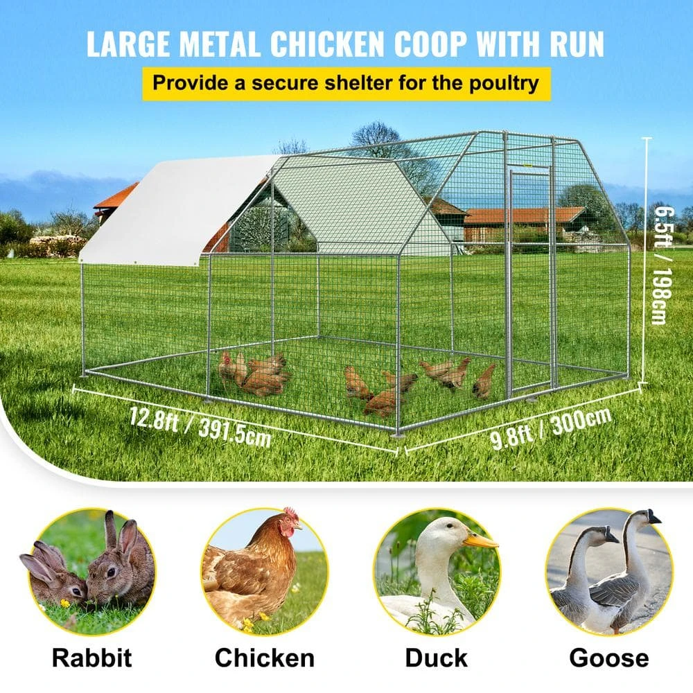 Our 12.8 ft. x 9.8 ft. x 6.5 ft. large metal chicken coop is constructed with a sturdy steel frame, solid enough to keep the poultry from escaping and secure from predators. And this hen run house is also stably stationed to withstand the wind and snow weather.The quadrangle wire mesh can keep the poultry inside the cage and avoid them coming out to mess with your backyard or farm. It is coated with PVC on the outside, secure for the chickens’ touch and grip.Featuring a durable sun and rain-proof tarp on the top, it is protective for the steel frame, wire mesh and animals under its cover. And the tarp is sturdy enough to avoid tear up or fade over time.