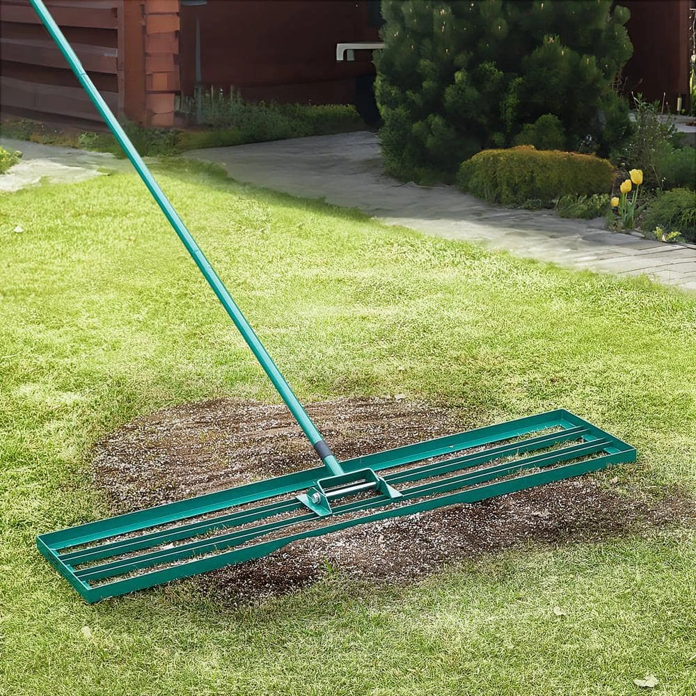 VEVOR Lawn Leveling Rake: Effortless Ground Smoothing. Our level lawn tool smooths extensive areas efficiently by moving the ground plate back and forth. With a 48 x 10 in. ground plate, it covers more ground in less time, effectively smoothing surfaces for neat lawns. Suitable for sand leveling, soil flattening, compost leveling, and moss smoothing.