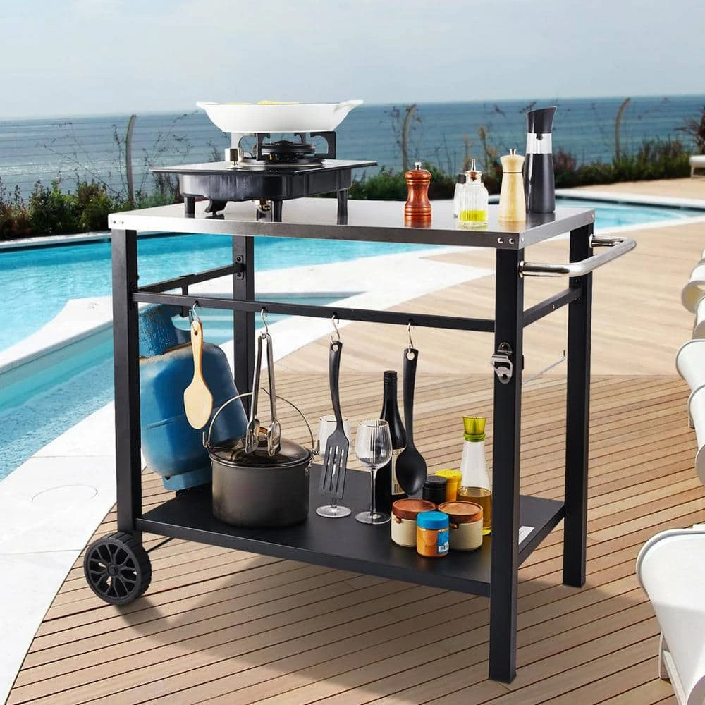 Double-Shelf Outdoor Grill Dining Cart. It can be used as a barbecue table or pizza oven stand, it can also be used for food preparation, storage, outdoor dining, and more. It provides a convenient and practical workstation for outdoor cooking.