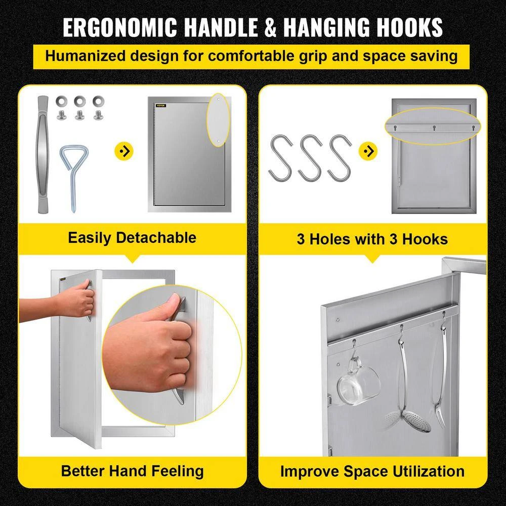 - Ergonomic Handle: The exquisite and ergonomic handle on the BBQ access door delights each opening with a comfortable hand feeling and is not easy to scratch your hand. Open the door, and you will find 3 holes for hanging hooks on the inner wall. 3 sturdy hooks are also provided, which allows you to hang BBQ tongs, gloves, and other grill stuff inside the door to save space