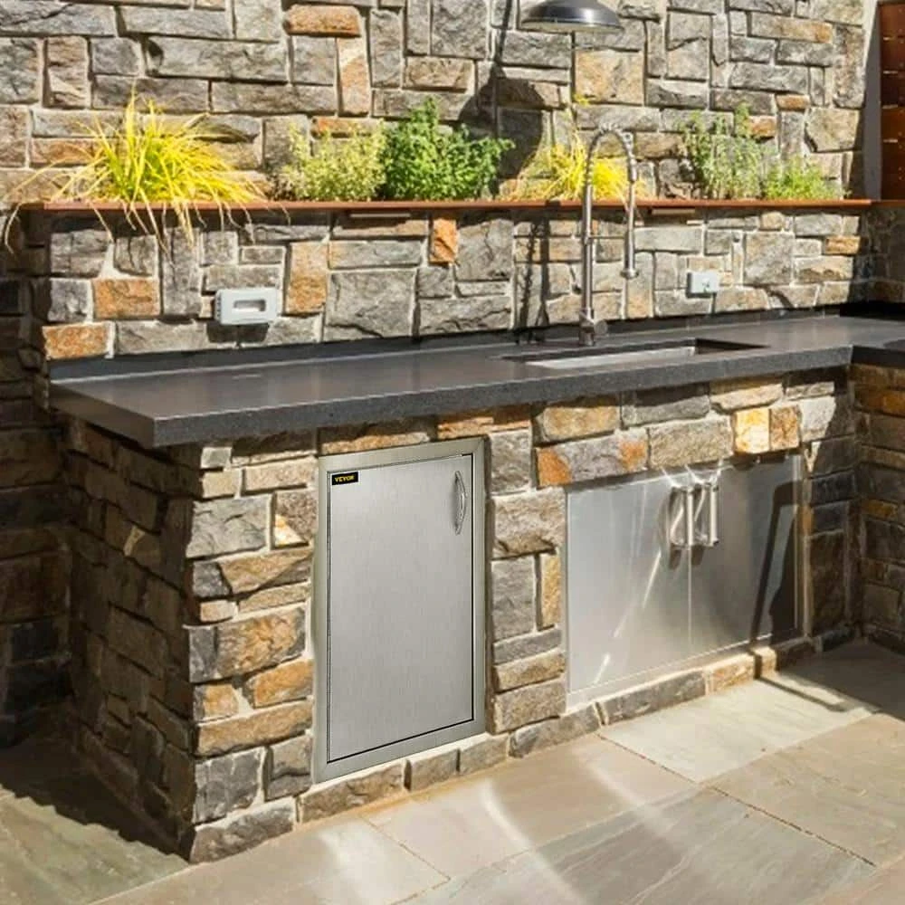 The VEVOR BBQ island doors are designed for the outdoor kitchen and BBQ island, being an elegant addition to your cooking area. the seamless design and magnetic closing system keep the stainless steel doors tightly sealed, with no dust, rainwater, or flies accessible. This door is finished to match all major brands of grills.