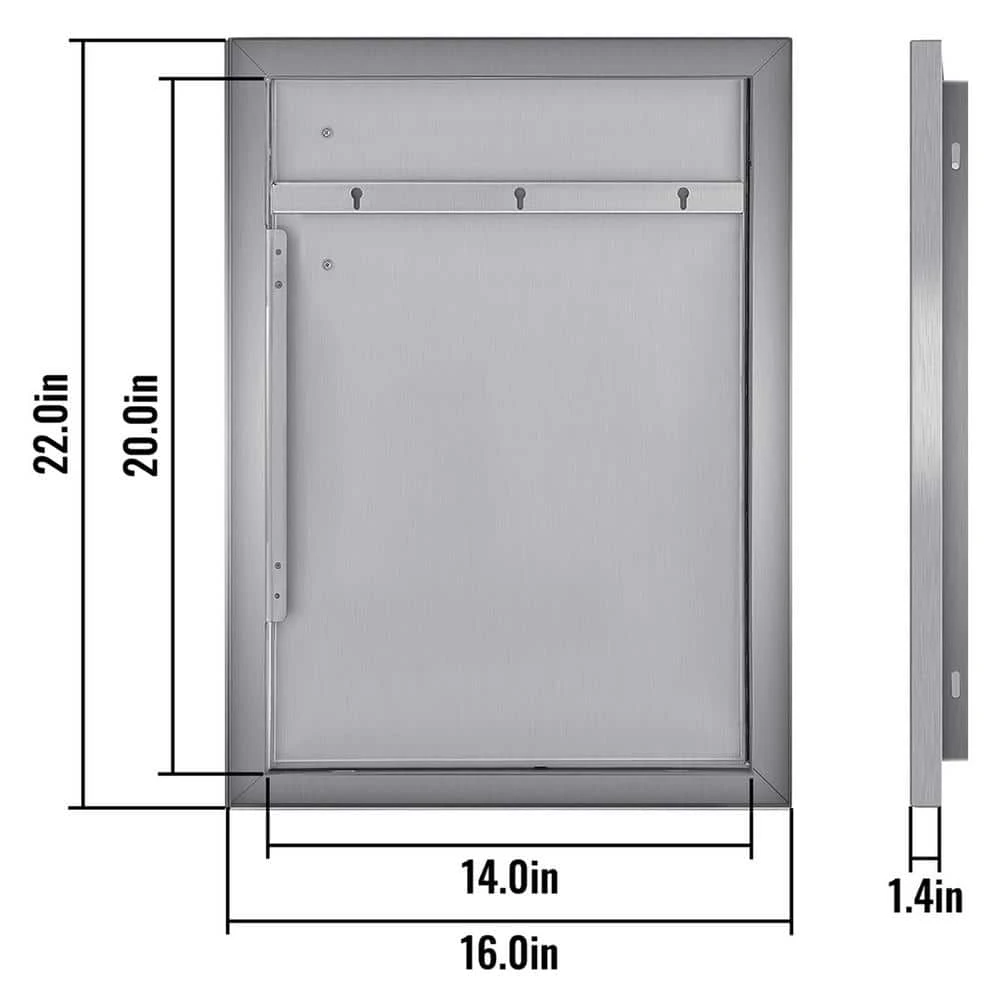 - Durable Construction: Overall Dimensions (W x H): 16 x 22 in.; Cutout Dimensions (W x H): 14 x 20 in.. The outdoor kitchen door, constructed with stainless steel, features corrosion and abrasion resistance. The brushed surface makes the door appealing, and it is easy to clean with no marks or smudges left. All seamless design and no sharp corners safeguard users’ security