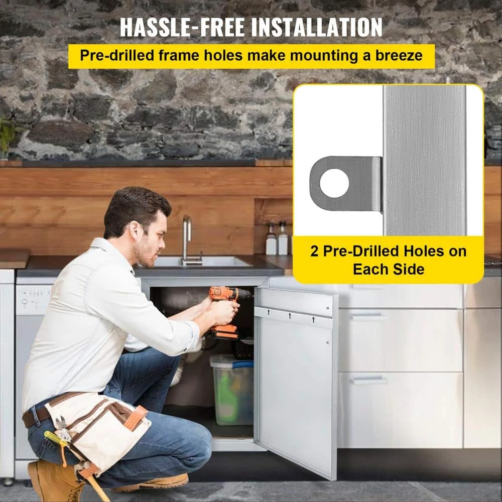 The VEVOR BBQ island doors are designed for the outdoor kitchen and BBQ island, being an elegant addition to your cooking area. With premium stainless steel, these outdoor BBQ doors feature improved corrosion-proof and scratch-proof performance, withstanding years of exposure to all kinds of weather. In addition, the seamless design and magnetic closing system keep the stainless steel doors tightly sealed, with no dust, rainwater or flies accessible.