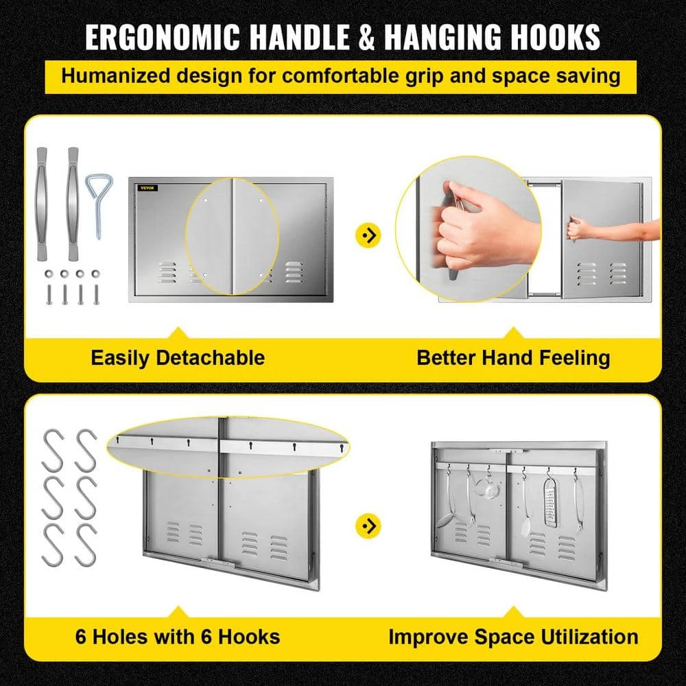 - Ergonomic Handles: The exquisite and ergonomic handles on the BBQ access doors delight each opening with comfortable hand feeling and are not easy to scratch your hand, open the doors, and you will find 6 holes for hanging hooks on the inner wall, 6 sturdy hooks are also provided, which allows you to hang BBQ tongs, gloves, and other grill stuff inside the doors to save space