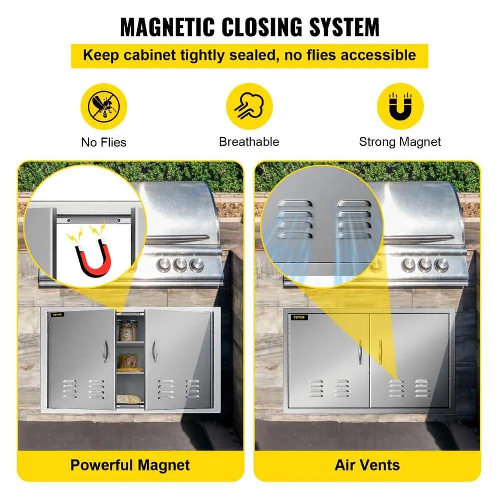 - Magnetic Closing System: The BBQ doors stainless steel are equipped with 2 built-in magnet blocks on both top and bottom frames for easy closing and enhanced sealing of the doors, the strong magnetic adsorption keeps your cabinet in a tight yet breathable state, stopping flies from entering, moreover, louvered vents help airflow and avoid odor caused by long-term sealing