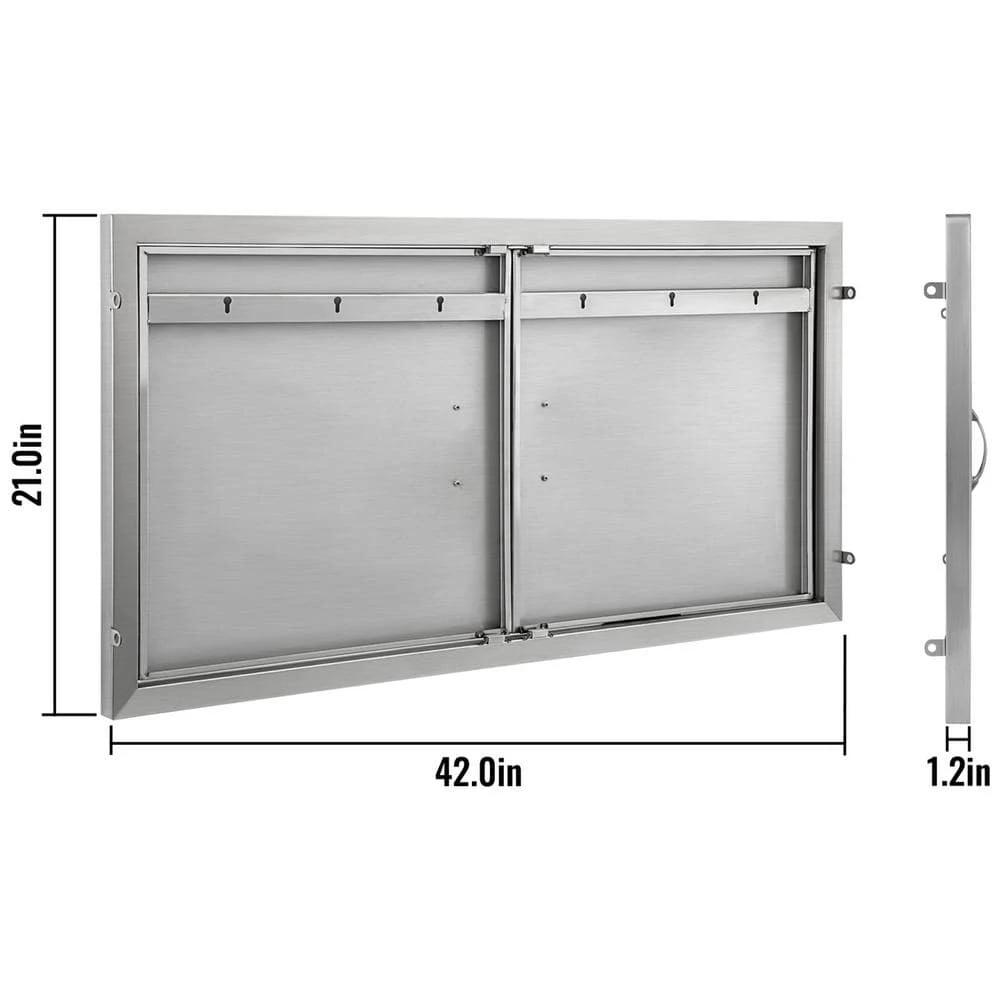 - Durable construction: overall dimensions: 42 in. W x 21 in. H; cutout dimensions: 42 in. W x 21 in. H, the outdoor kitchen doors, constructed with stainless steel, feature corrosion and abrasion resistance, the brushed surface makes the door appealing and it is easy to clean with no marks or smudges left, all seamless design and no sharp corners safeguard users’ security