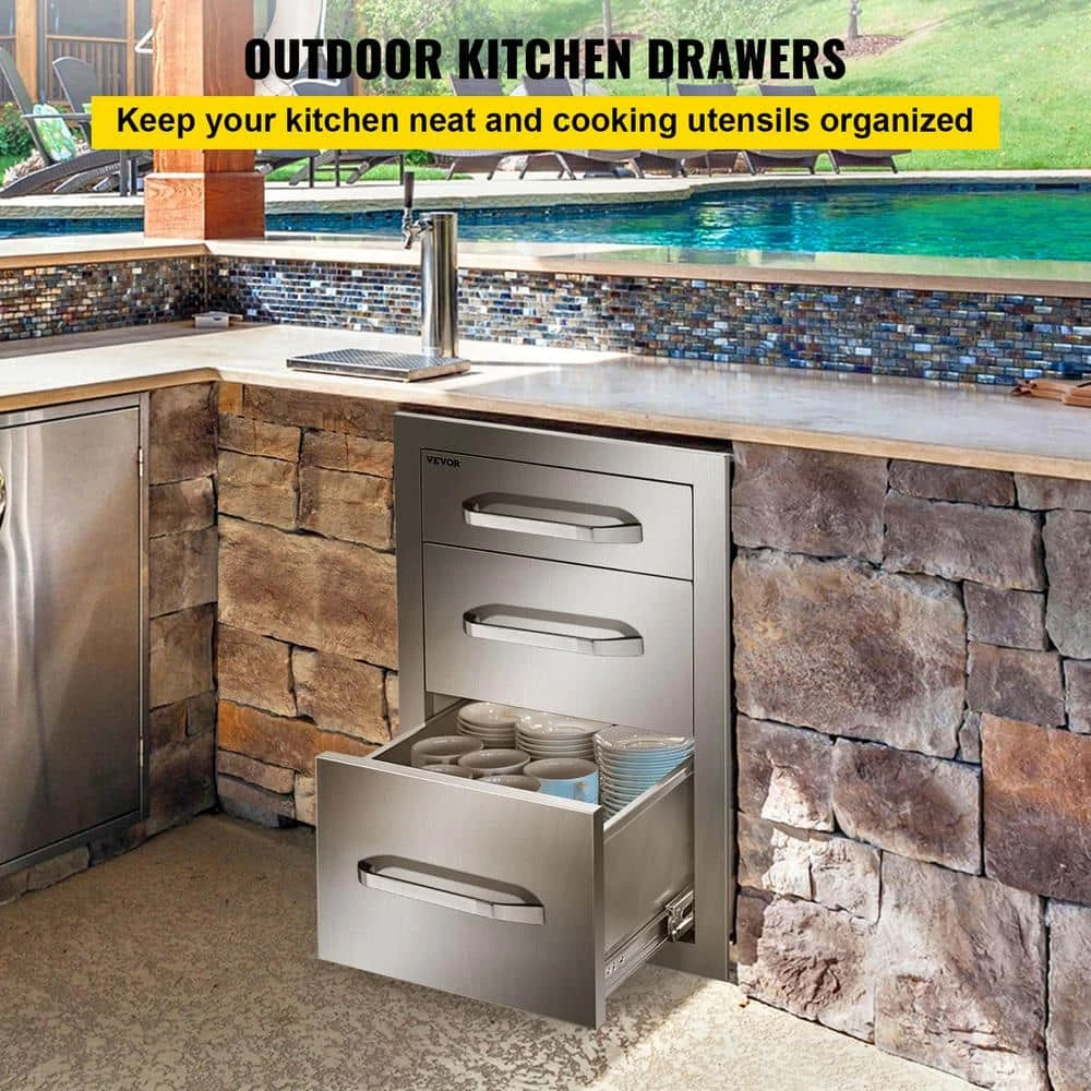 The VEVOR premium outdoor kitchen drawers with double storage space, ensuring a large storage space to put kitchen things. Made of stainless steel, it is durable and sturdy for long time use. Also anti-corrosion and easy to clean. With the fully enclosed box, it can effectively prevent the insides from rain, wind, dust, and insect. Perfect for the outdoor kitchen and BBQ island to use.