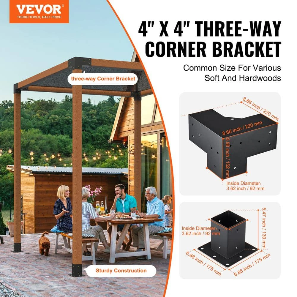 - 4 in. x 4 in. 3-way pergola brackets: this durable and strong pergola bracket kit that covers wooden beams, preventing them from rotting due to rainwater and harsh Sunlight, it is designed for the mainstream 4 in. x 4 in. specifications and can accommodate actual dimensions of 3.6 in. x 3.6 in. (92 mm x 92 mm) for both soft and hardwood