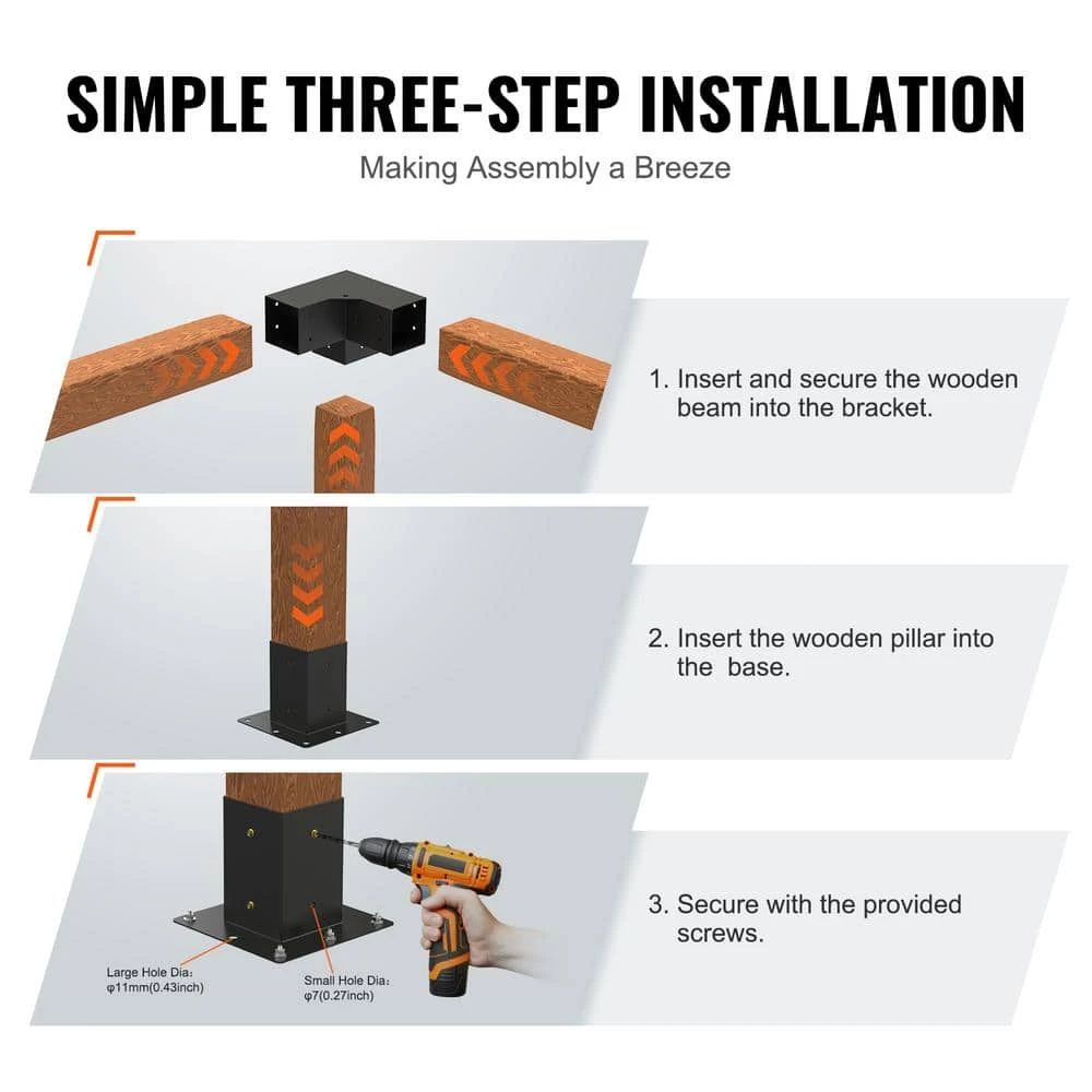 VEVOR High-Quality Brackets: Stable and Secure. Our brackets, available in multiple sizes and specifications, are compatible with various standard wood posts. Constructed from thick carbon steel plates, they are welded for durability and coated to resist corrosion and rust. Choose VEVOR for a secure solution.