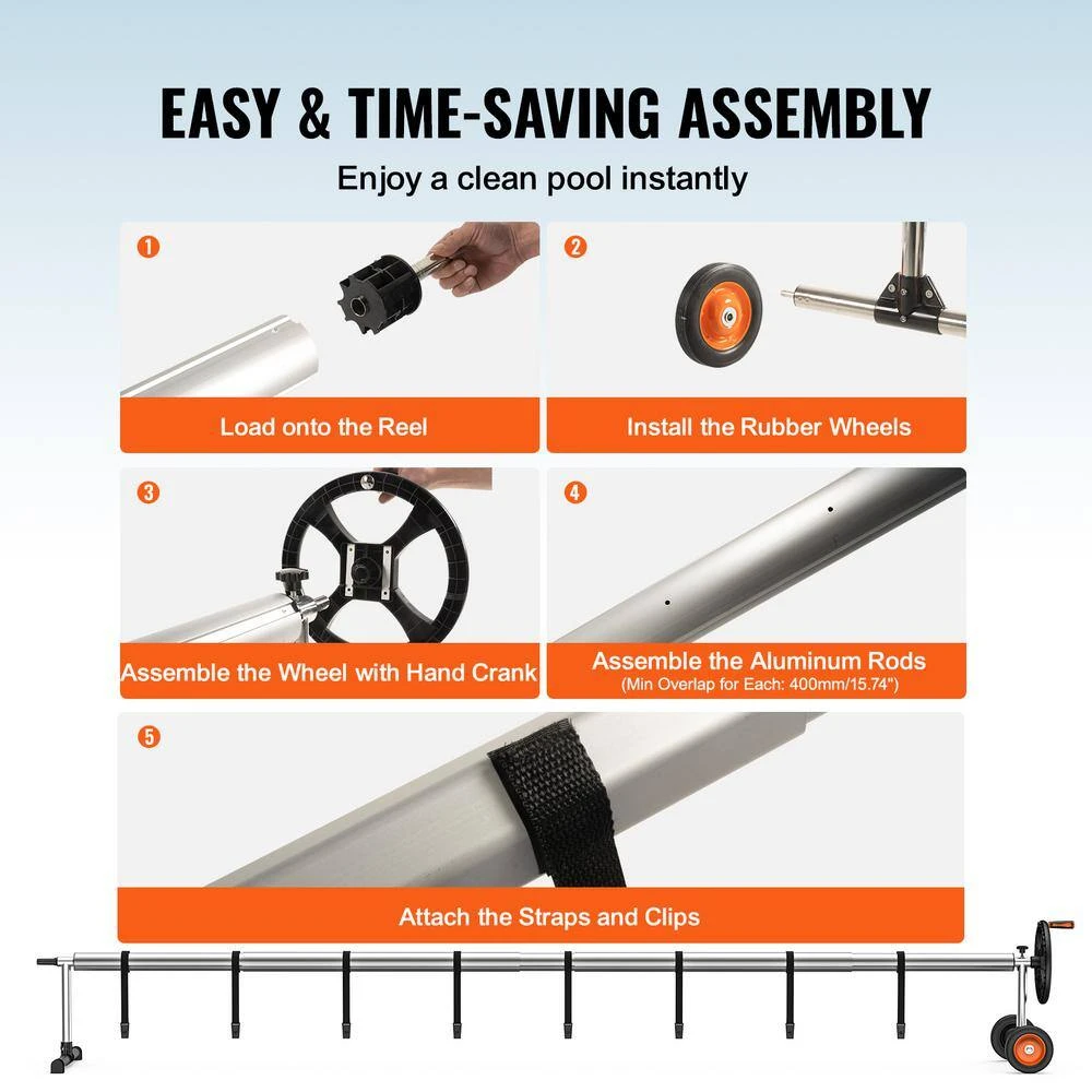 - Versatile fit: with a wide adjustment range from 4.15 m to 6.64 m/13.61 ft. to 21.78 ft., our solar pool cover reel perfectly fits for inground swimming pools of various sizes whether you have a standard or custom-sized pool, our reel eliminates sizing concerns and offers a hassle-free solution