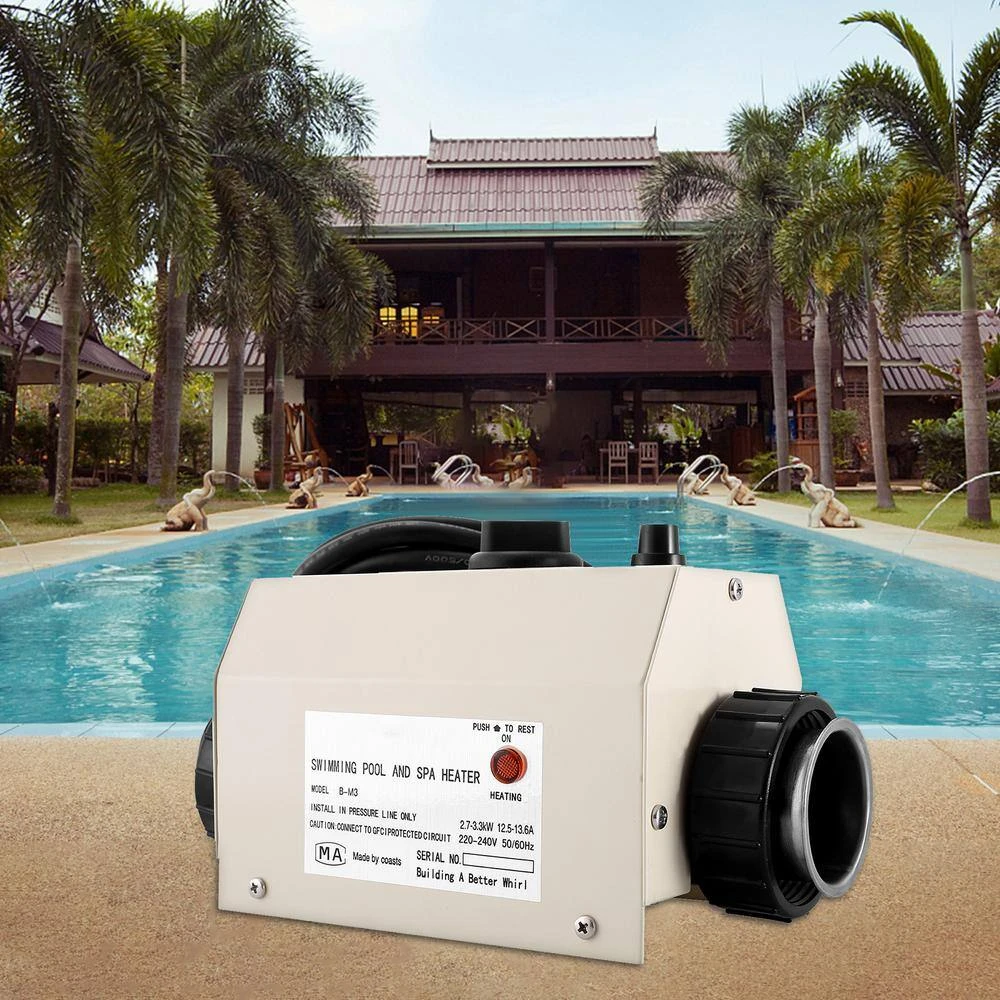- Specifications: material: metal, voltage: AC 220-240-Volt/50-60Hz, power: 2.7-3.3 KW, current: 14 A, wire:0.12 x 0.16 in., pipe diameter: 1 in., size:13.4 x 4.8 x 5 in., net weight: 4.4 lb., phase parameters: single phase, suitable for: maximum 2 cbm hot tub and swimming pool equipment