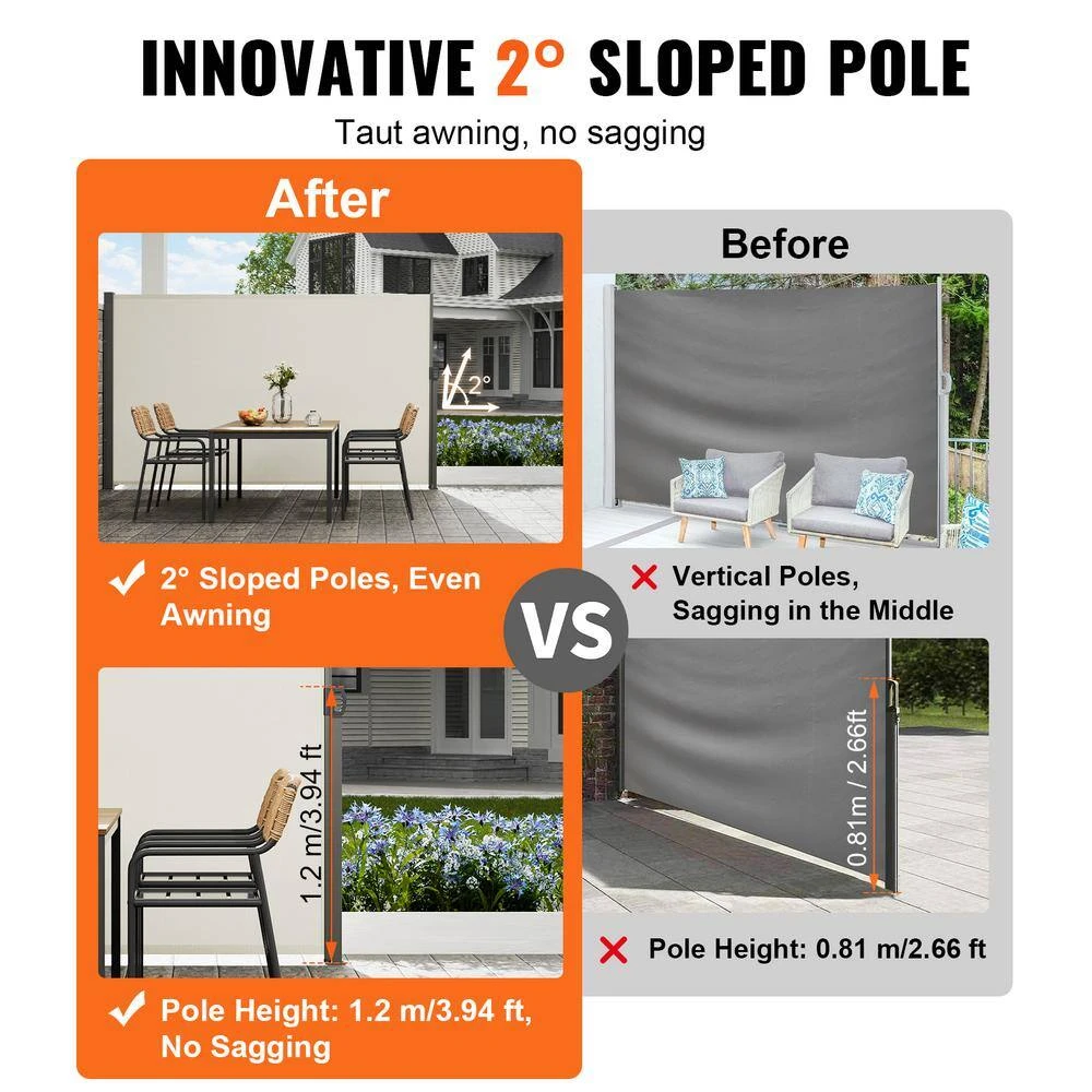 - High-quality material: our retractable side awning is made from 180g/sq.m high-density polyester fabric with a PU coating, providing excellent waterproof performance and tensile strength, it effectively blocks wind and rain, resists UV rays (UV30+), extends its lifespan and ensures stable shelter for outdoor activities