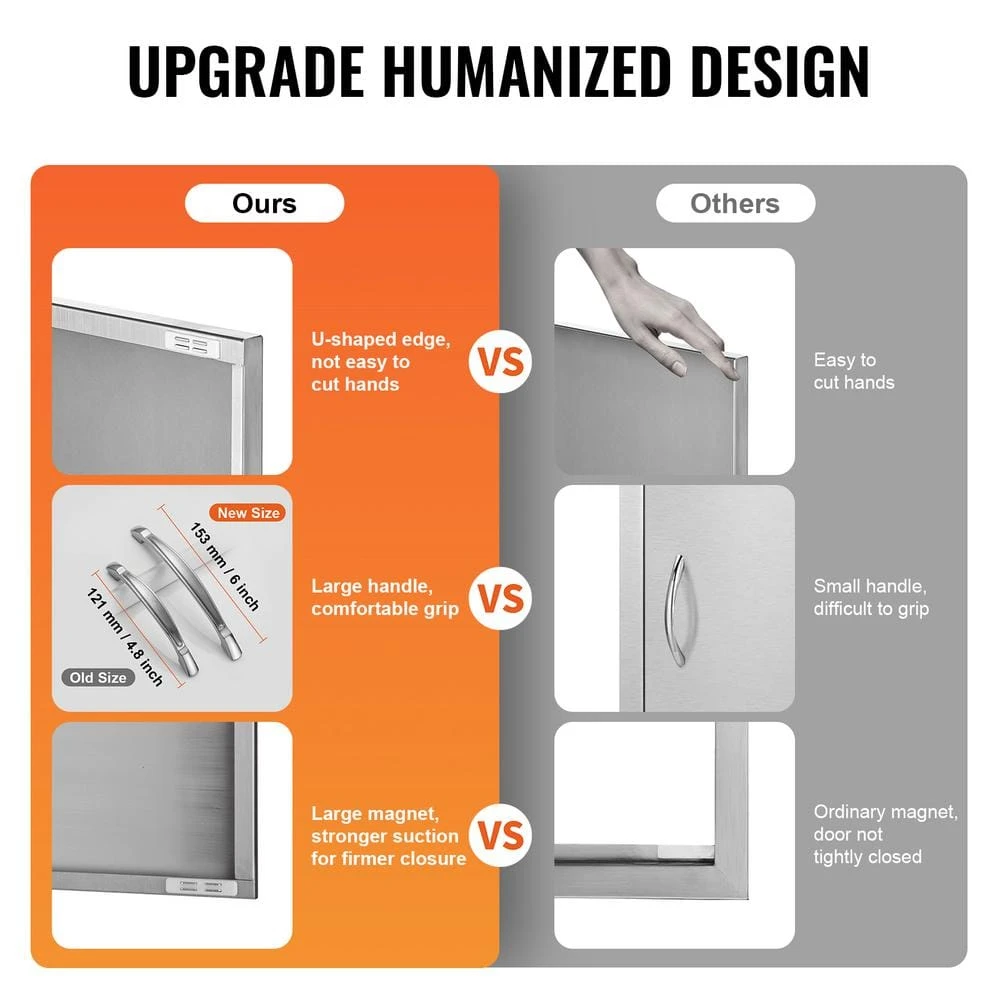 - Humanized design: delicate zinc alloy handles conforming to ergonomics, enlarged size for easy opening, the door frame edges are bent and thickened for safer use, providing a more user-friendly experience, allowing you to enjoy cooking in your outdoor kitchen without worries