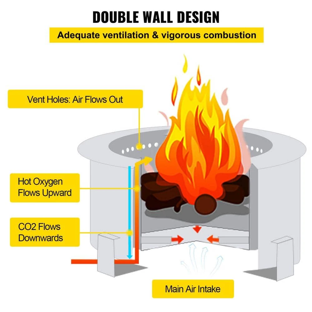- Double Wall Structure: Our smokeless fire pit adopts a double-walled construction for improving the airflow, bottom vent holes intake air to make the fire grow and channel oxygen up between the fire pit walls for air circulation, in addition, this structure ensures thermal insulation effect, keeping you from unforeseen accidents