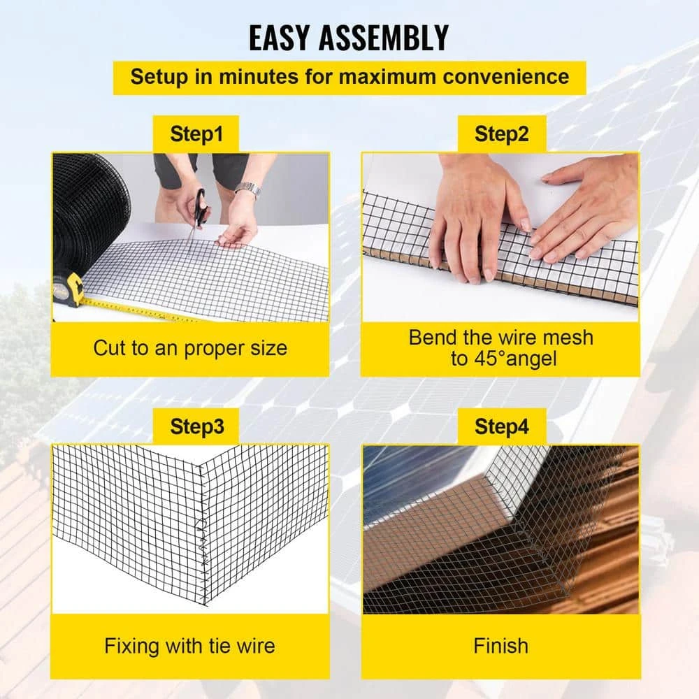 The VEVOR 8 in. x 98 ft. solar panel bird mesh made of PVC-coated steel is nearly invisible after installation. Removable and no drilling required. It is designed to keep birds and critters away and block them from nesting under your solar panels.