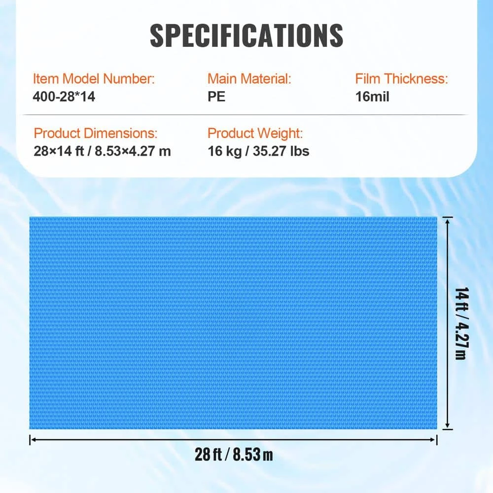 Long-lasting 28 x 14 ft solar pool cover. With our solar cover made from 16mil thick pe material, enjoy long-lasting and stable insulation. it’s robust and durable, reducing the need for frequent replacements.