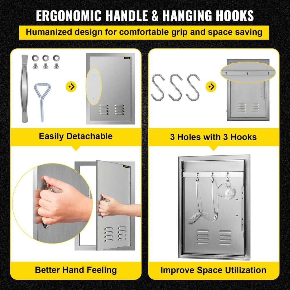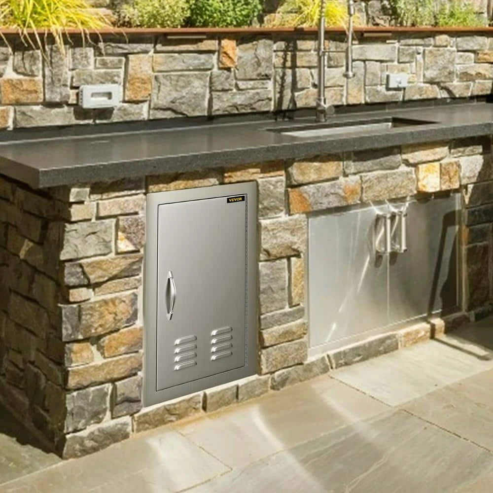 The VEVOR BBQ island doors are designed for the outdoor kitchen and BBQ island, being an elegant addition to your cooking area. With premium stainless steel, these outdoor BBQ doors feature improved corrosion-proof and scratch-proof performance, withstanding-years of exposure to all kinds of weather. In addition, the seamless design and magnetic closing system keep the stainless steel doors tightly sealed, with no dust, rainwater, or flies accessible.